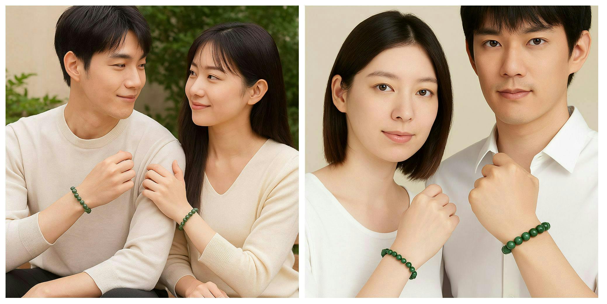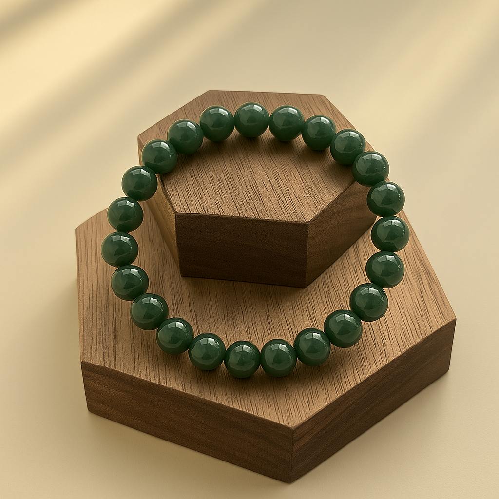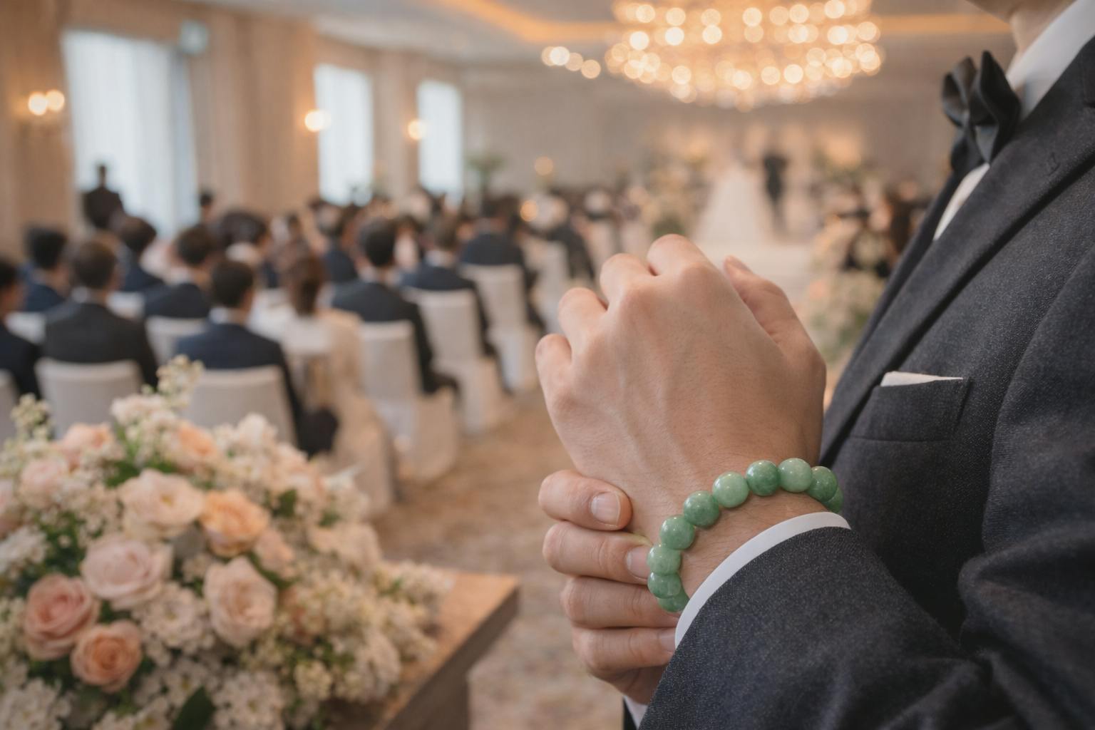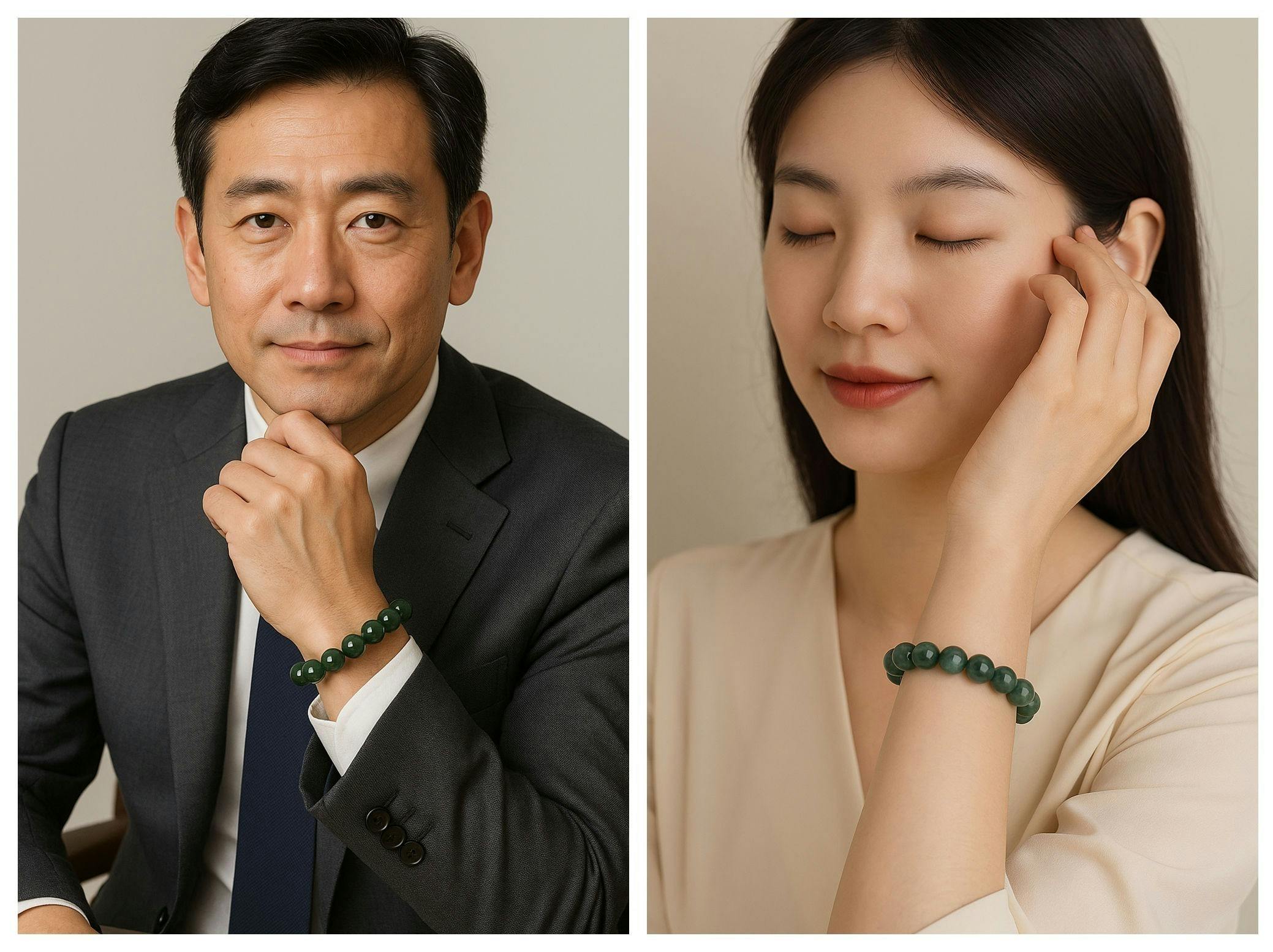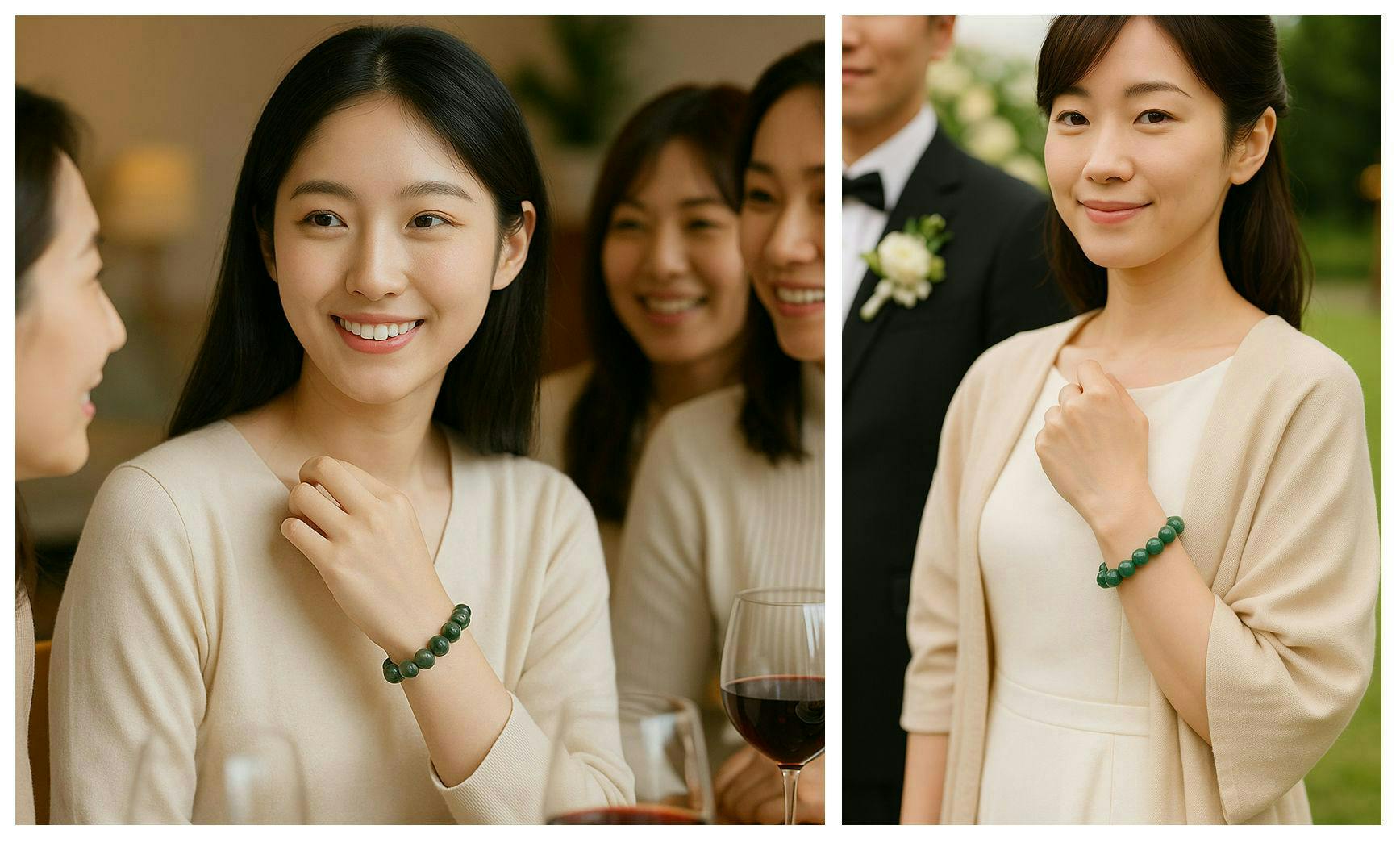 翡翠ブレスレットは、スーツやフォーマルスタイルにも自然に馴染み、手元にさりげかな品格を添えます。