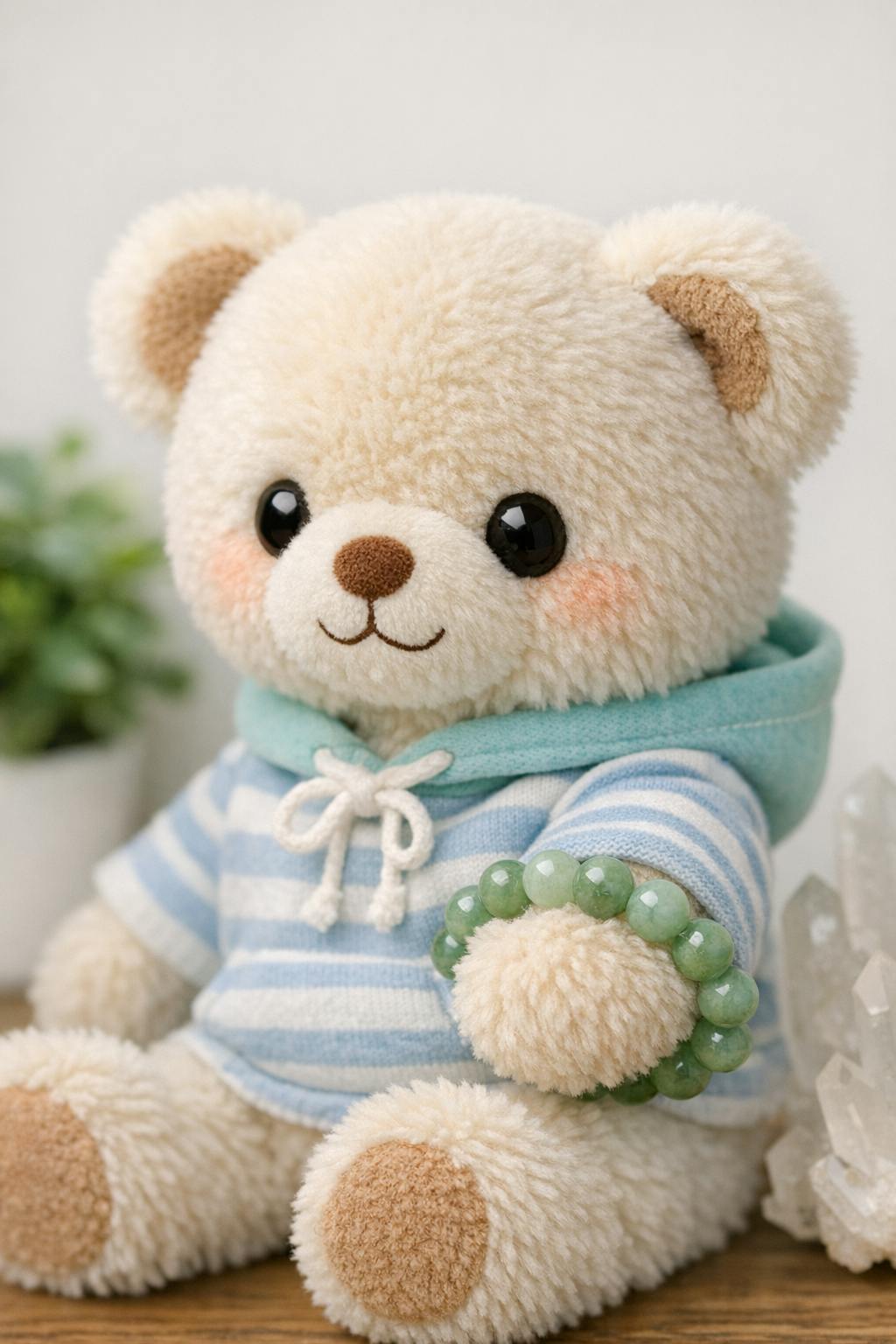 大切なぬいぐるみに翡翠ブレスレットをつければ、まるで“お守り”のように日々を優しく包んでくれます。