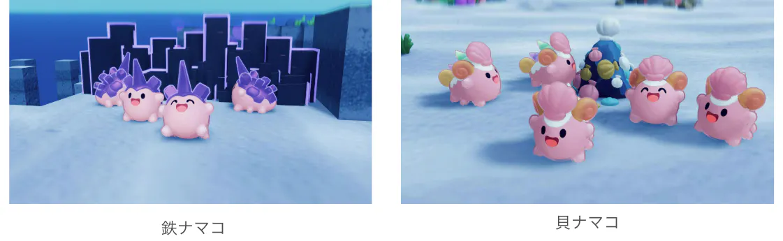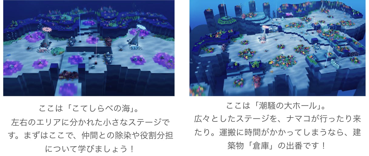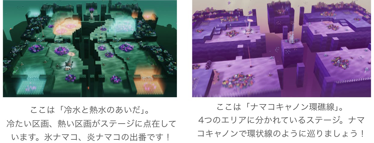 石灰の収集が得意な貝ナマコ、鉄鉱石の採掘に長けた鉄ナマコ、高温・低温を耐えられる炎ナマコ・氷ナマコなど、性質の異なるユニークなナマコたちが登場!それぞれの特性を活かし、役割分担を行いステージクリアを目指そう。