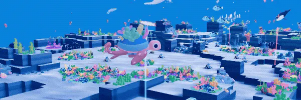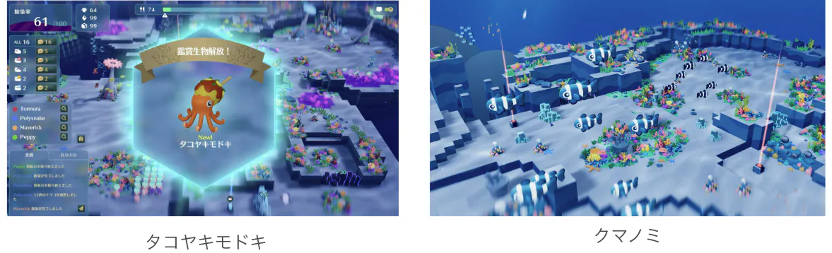 除染が進むとサンゴが芽吹き、光が差し、海は少しずつ鮮やかな色を取り戻す。そして合計40種超の「鑑賞生物」が回遊をはじめ、海を彩る。除染に励み、鑑賞生物の全種類コンプリートを目指せ!