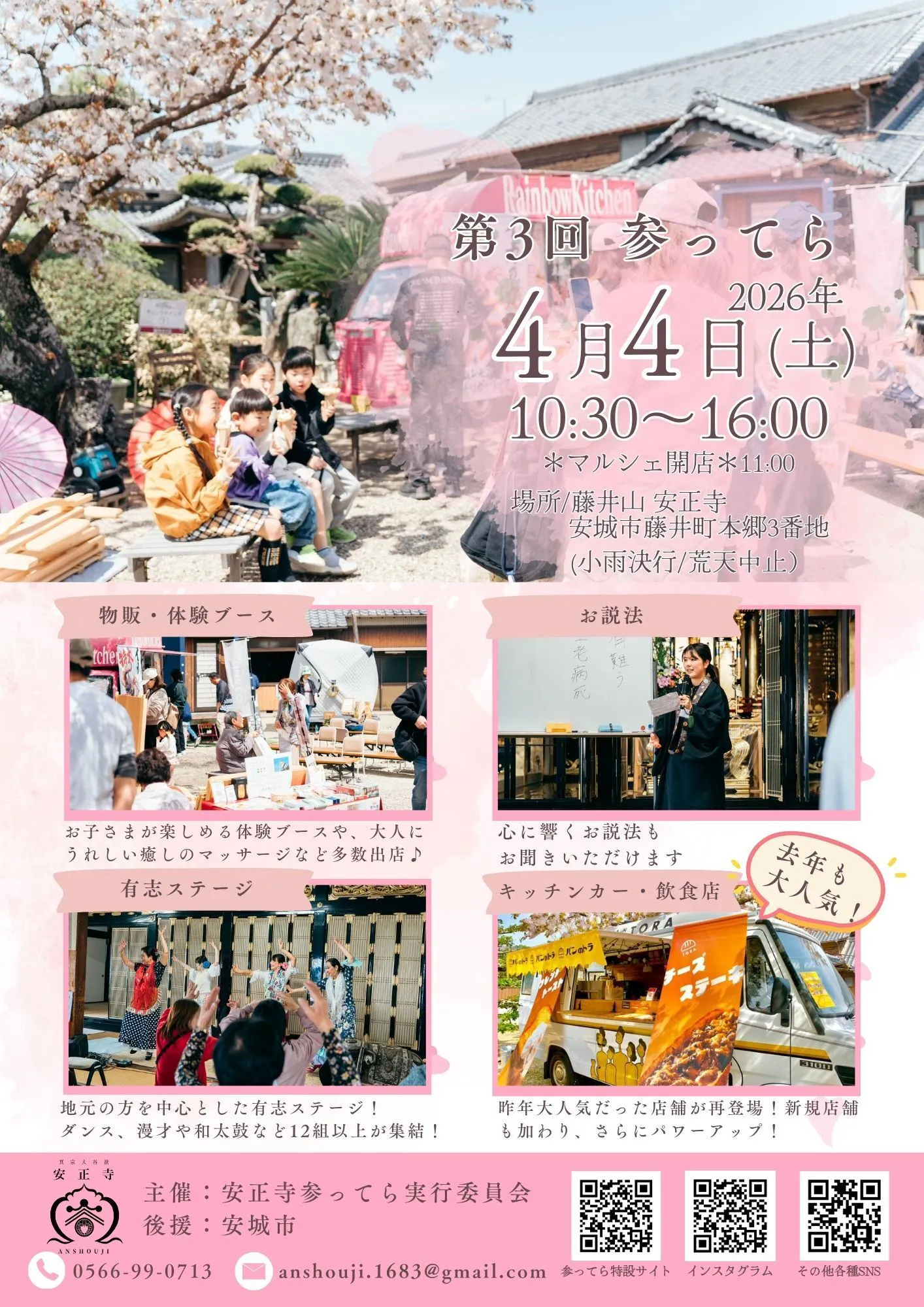 今回のチラシには、・お子さまも楽しめる体験ブースや物販・心にそっと響くお説法・地域の方が主役の有志ステージ・昨年も大好評だったキッチンカー・飲食店など、「参ってら」らしい“にぎわい”と“あたたかさ”が伝わるよう、想いを込めて詰め込みました。