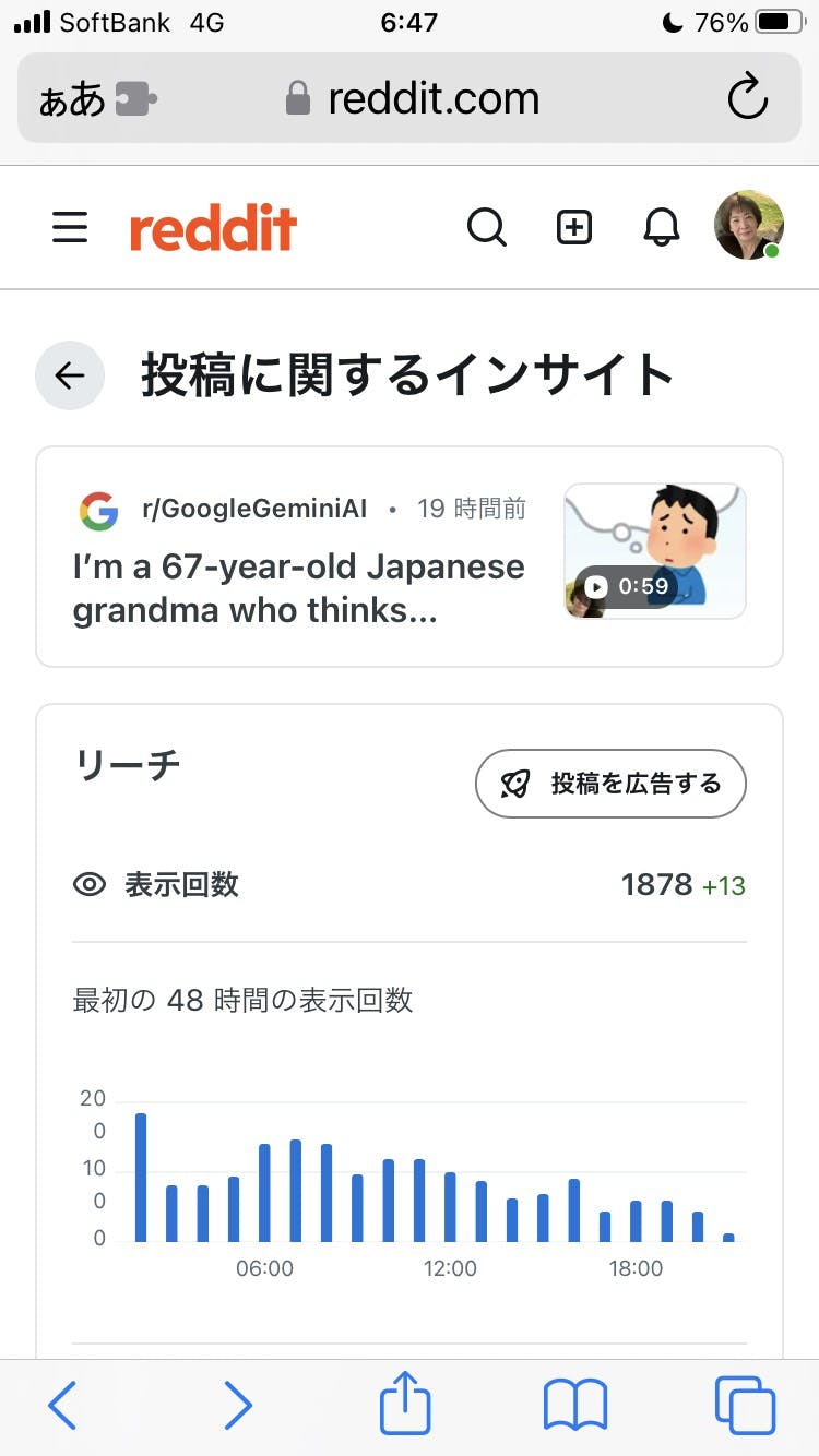 2026/01/02 13:05ご支援・応援してくださっている皆様 プロジェクト実行者です。「このアプリをどうしても日本の子どもたちに届けたい」 その一心で、元旦から海外(英語圏)への発信に挑戦しておりました。翻訳AIを相棒に、世界最大級の掲示板「Reddit」にて、開発への想いとデモ動画を英語で投稿しました。その結果…… 公開からわずか1日で、2000回の表示を突破し、10件のシェア(共有) をいただきました。 半分以上がアメリカからのアクセスで、言葉の壁を超えて注目され始めています!「67歳の日本のおばあちゃんが、子どもたちのために作った」というストーリーが、海を超えて届いたのだと思います。 世界がシェアしてくれたこのアプリ、絶対に日本で完成させたいです。たった一人での挑戦ですが、世界が見てくれています。 どうか、日本の皆様も力を貸してください。 引き続き、応援よろしくお願いいたします! もっと見る