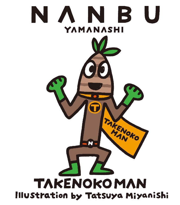 「おまえうまそうだな」で有名な絵本作家である「宮西達也」先生がタケノコをモチーフにデザインしてくださった、とってもキャッチーなキャラクター「タケノコマン」が南部町の公式キャラクターです。