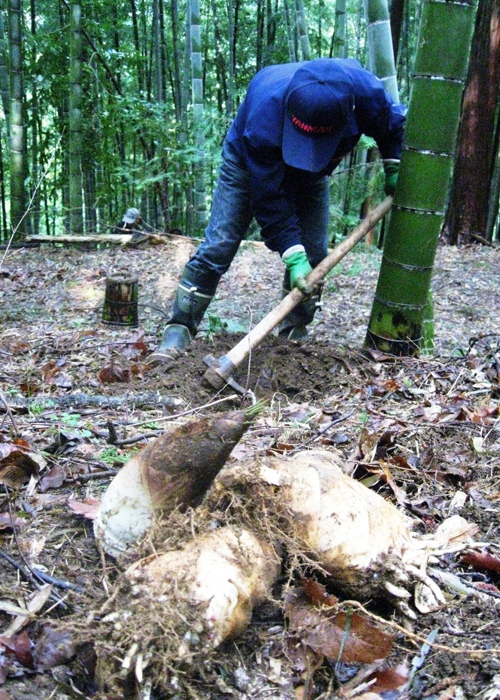 町の東西の山が長い日陰を作り、東側の竹林は日の出が遅く、西側は日の入りが早く、太陽がまだ低い春先は日照時間が極端に短いため、地温が温まりにくく、たけのこも成長が遅いのですが、これが長い期間良質なたけのこを生み出す環境でもあります。