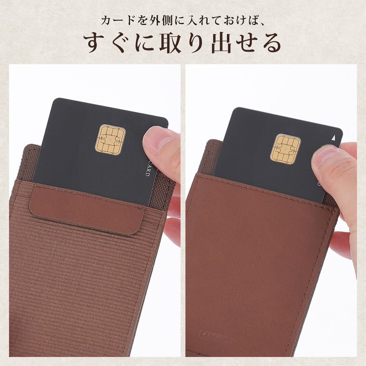 カードを入れるのに便利なレザーポケット。利用頻度の高いカードを外側に入れることで、すぐに取り出せます。