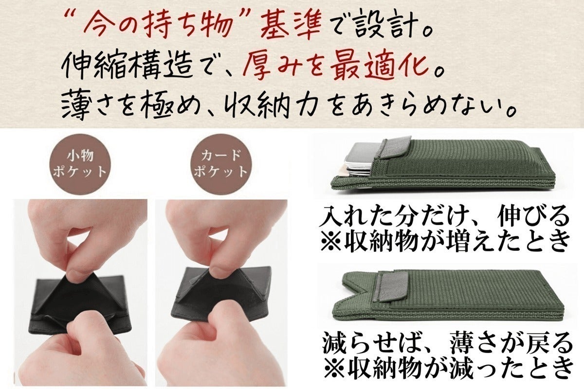 今回の財布は、長財布や折りたたみ財布では実現ができない、小ささと薄さを両立した設計です。財布の中身が少ないほど財布の厚さが6mmに近づく、キャッシュレス時代に合わせた、未来を先取りした財布です。
