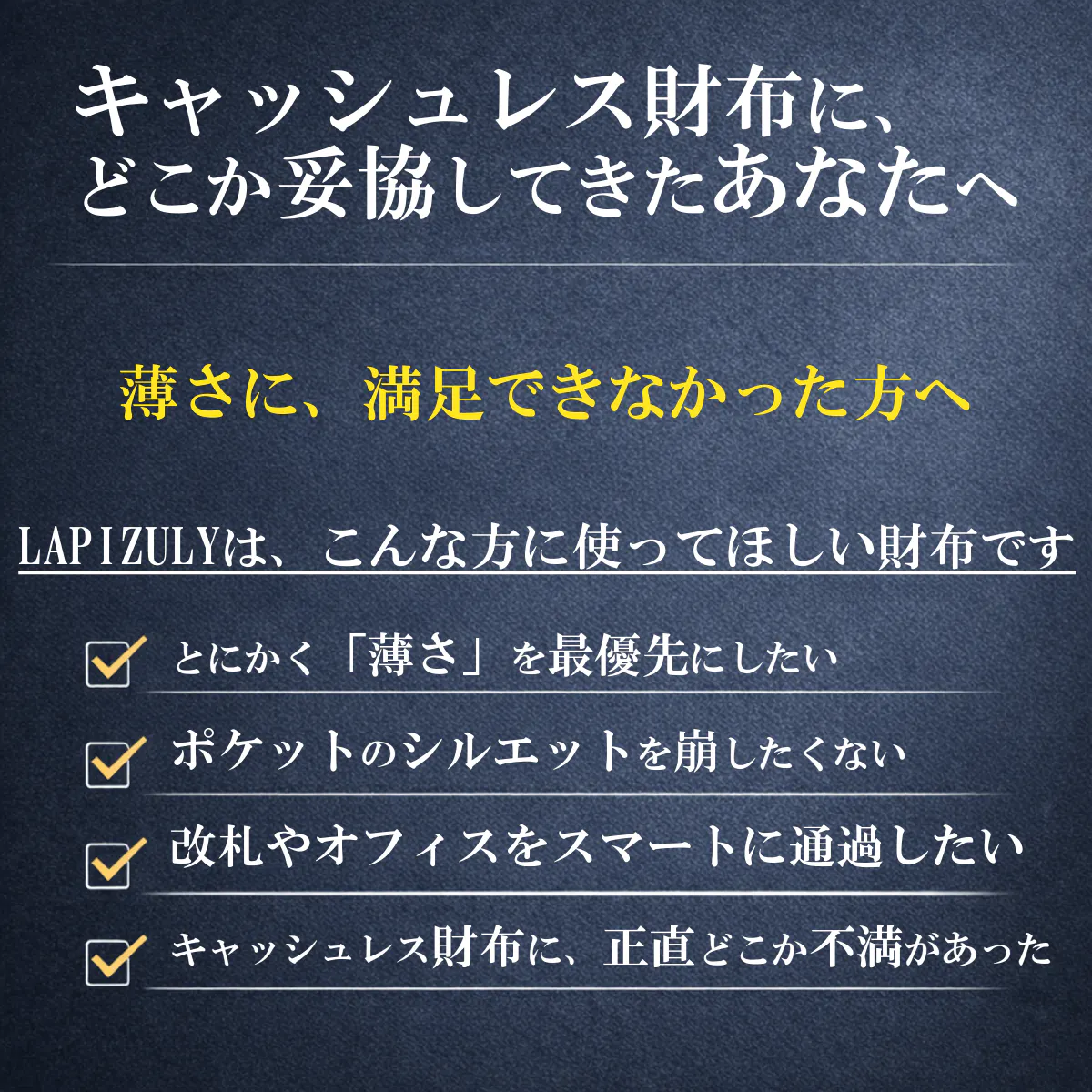 キャッシュレス化が進む中、財布に求められる役割も変化しています。 カードと少額の現金を、より薄く、よりスマートに持ち歩く。 それを実現した財布がLAPIZULYです。