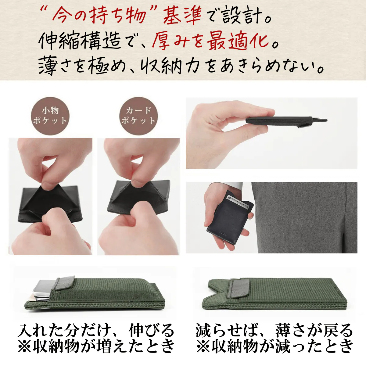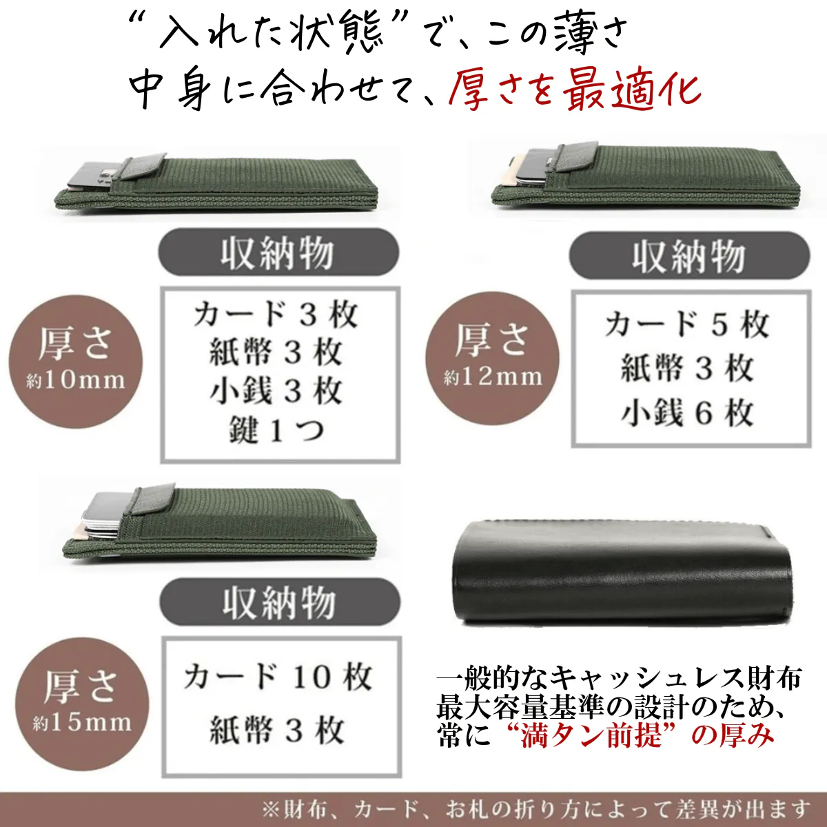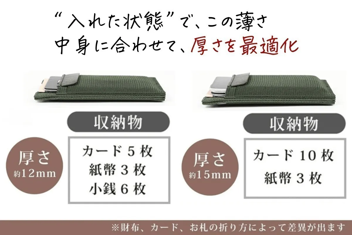 ※収納物が少ないほど、薄い財布として使用することができます