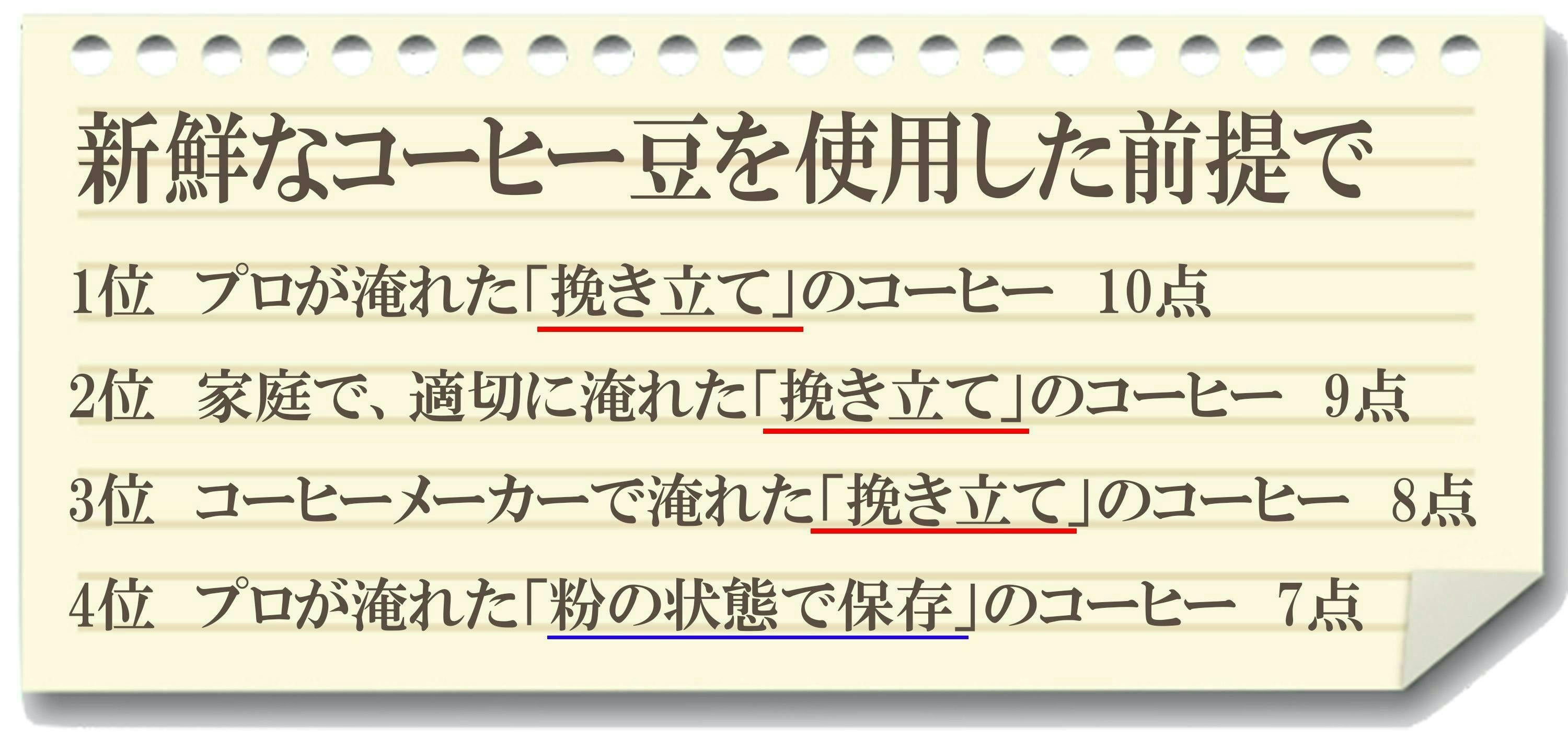 また、この点数表は、新鮮なコーヒー豆使用が前提ですが、古くなった珈琲豆ですと、プロが淹れようと挽きたてだろうと0点です。