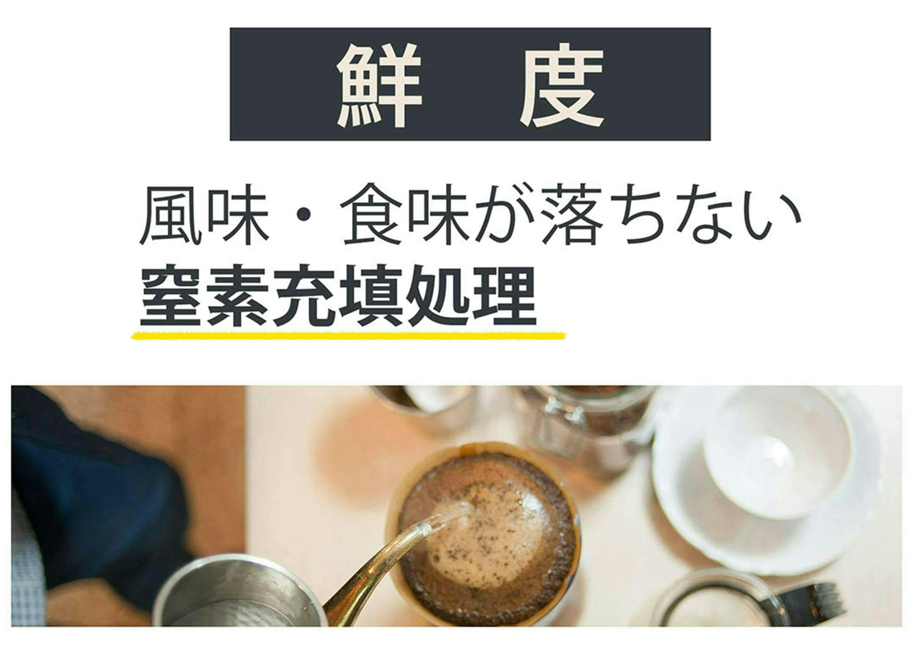 空気に触れることにより酸化が進みます。 その結果、風味・食味が落ちていきます。 それを遅らせるために、窒素ガス充填パックを採用しております。 窒素ガスには食品の酸化を遅らせる効果があり焙煎したての食味を維持することができます。