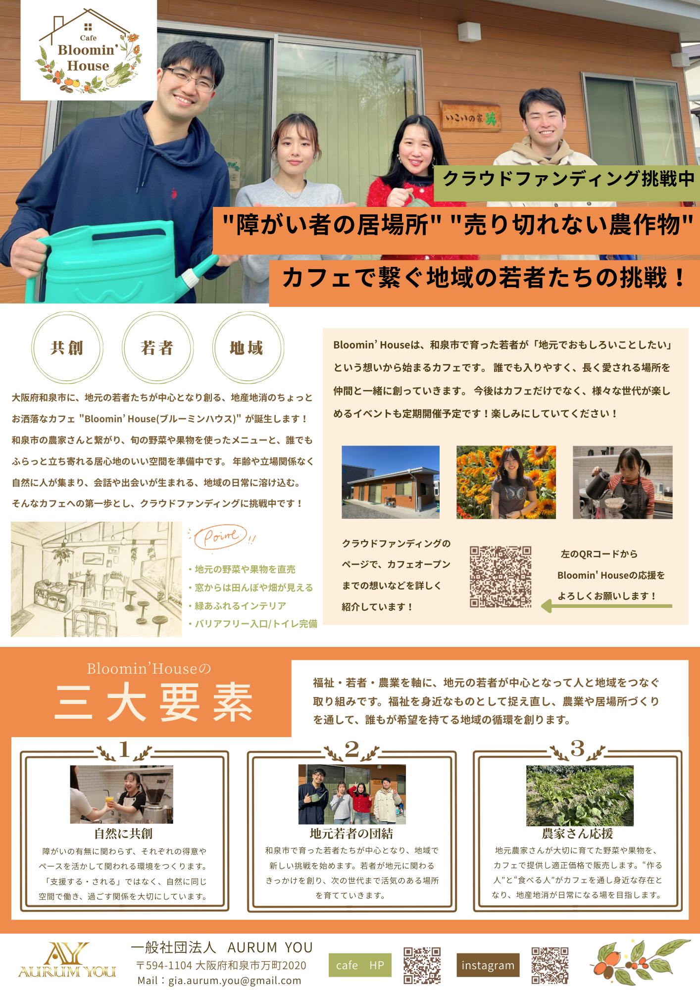 大阪府和泉市でBloomin'House(ブルーミンハウス)というカフェを4月にオープンします!ダウン症の妹との日々から、障がい者が自然に共存することの難しさ、地域との関わりで農作物が売り切れず捨てられる課題を知りました。地元の若者が和泉市に、希望の花が咲く場所を創り、解決します!応援お願いします!