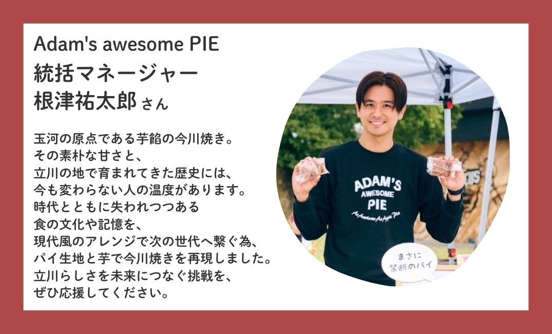 根津さんが作ってくれる今川焼の鉄板で作るパイは絶品です。アダムスオーサムパイにはもっとたくさんのパイがあります。