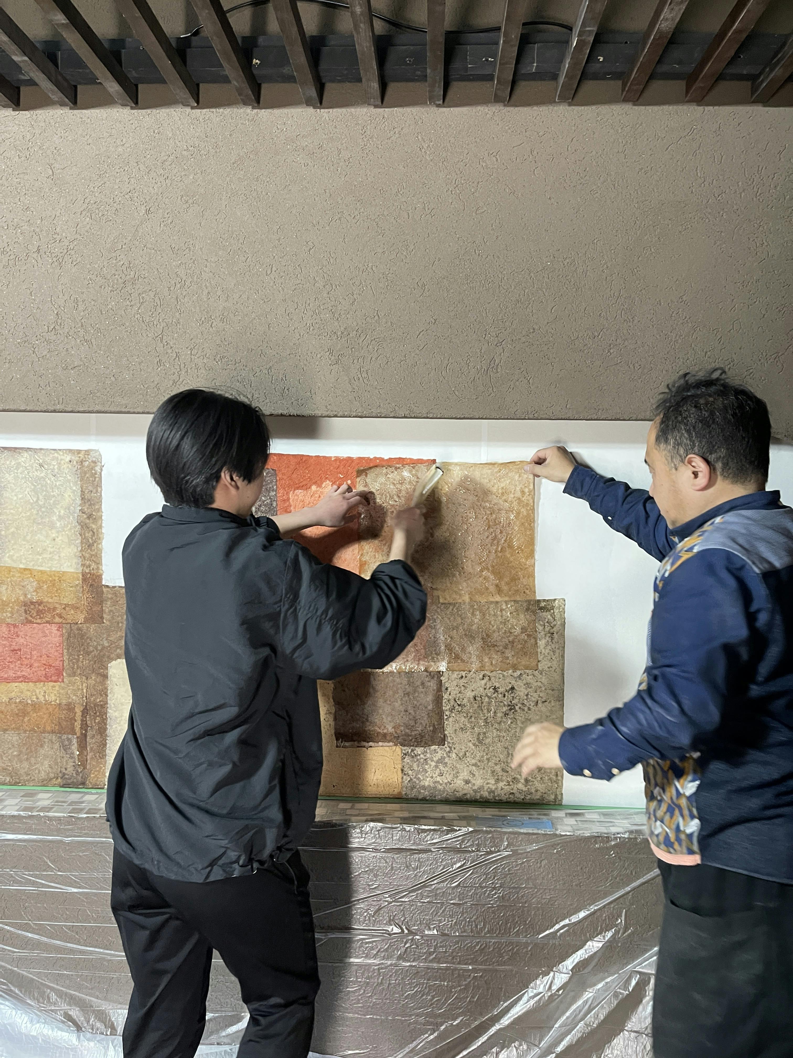 慣れない作業に苦戦しつつも、一枚一枚、想いを込めて貼ることで、少しずつ温かみのある空間になってきています。