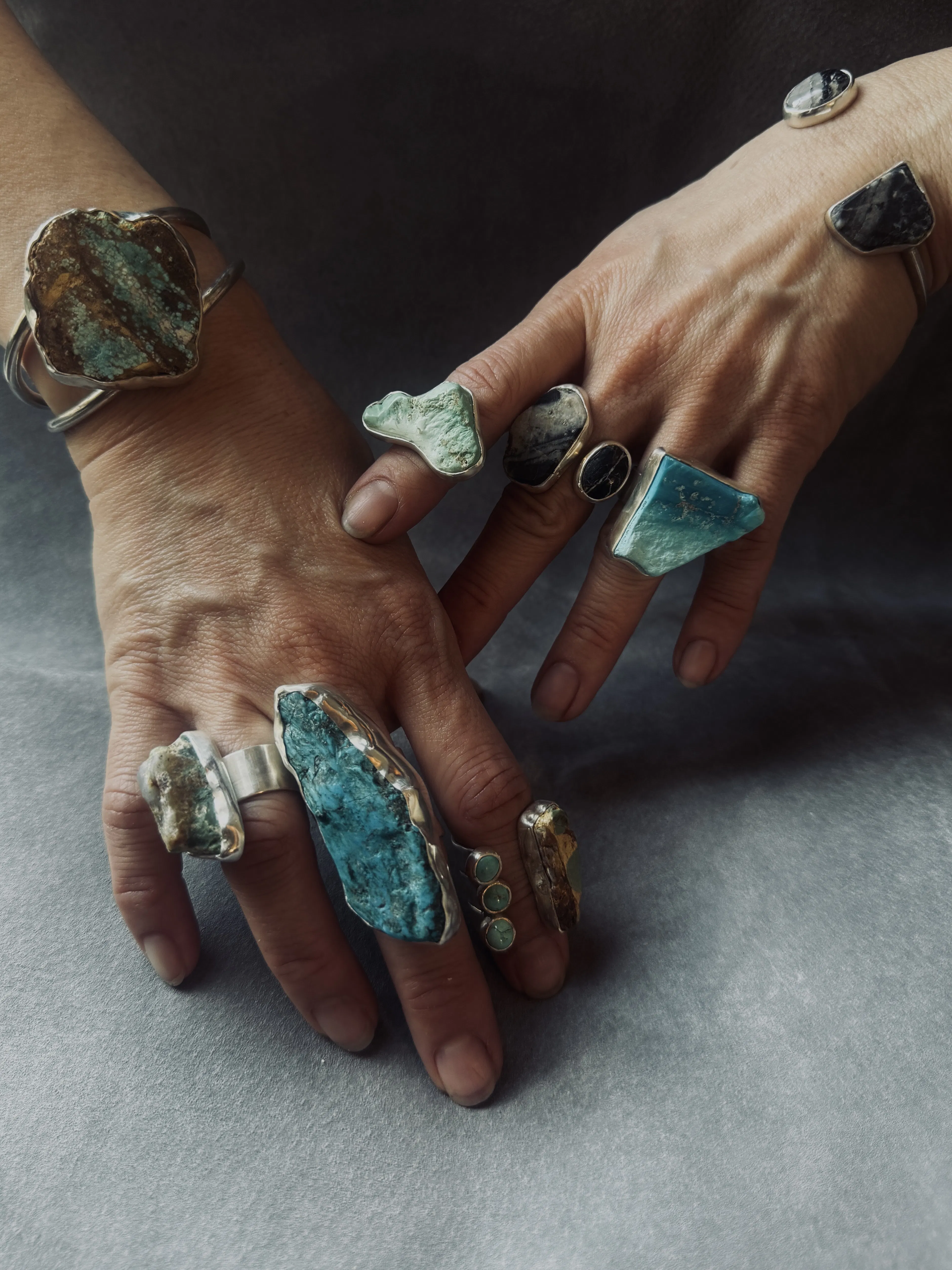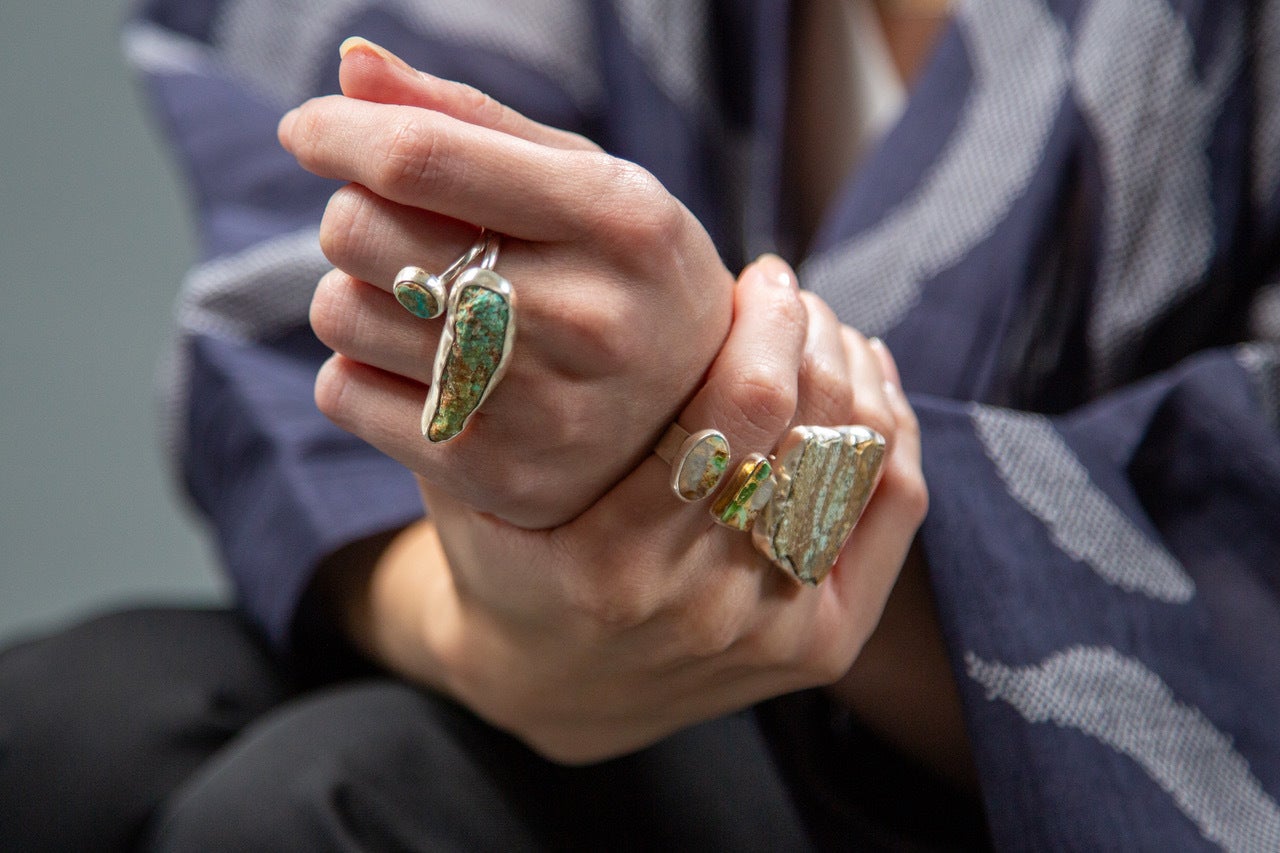 一般的にターコイズというと「ターコイズブルー」の鮮やかなブルー一色の石を思い浮かべます。日本では特に、同じ色、同じ形に形成するため、ブルーの部分のみを抽出し加工されることが多いのですが、私は原石そのものの持つ表情の豊かさに魅了されました。