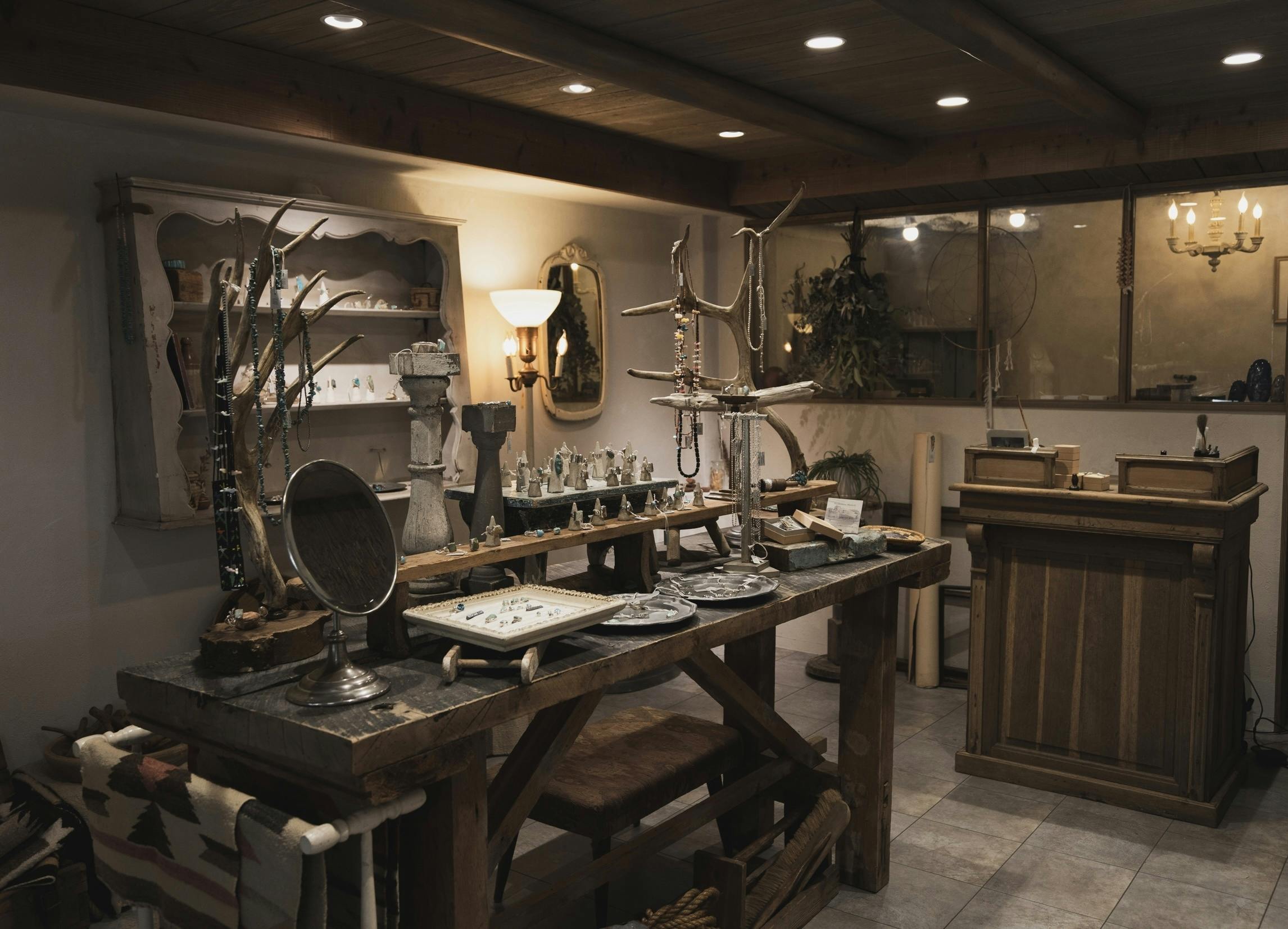 さらに進んだ奥には、神楽坂店と同様にsycamoreの一点もののジュエリーが並びます。突き当たりの壁には100年以上も時を経たアンティークのインディアンジュエリーが、そのオーラを放ち陳列されています。