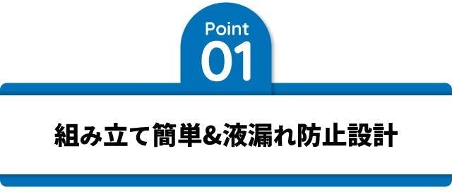 内部の漏斗構造により液体がスムーズに収まり、満杯になっても液漏れしない設計です。