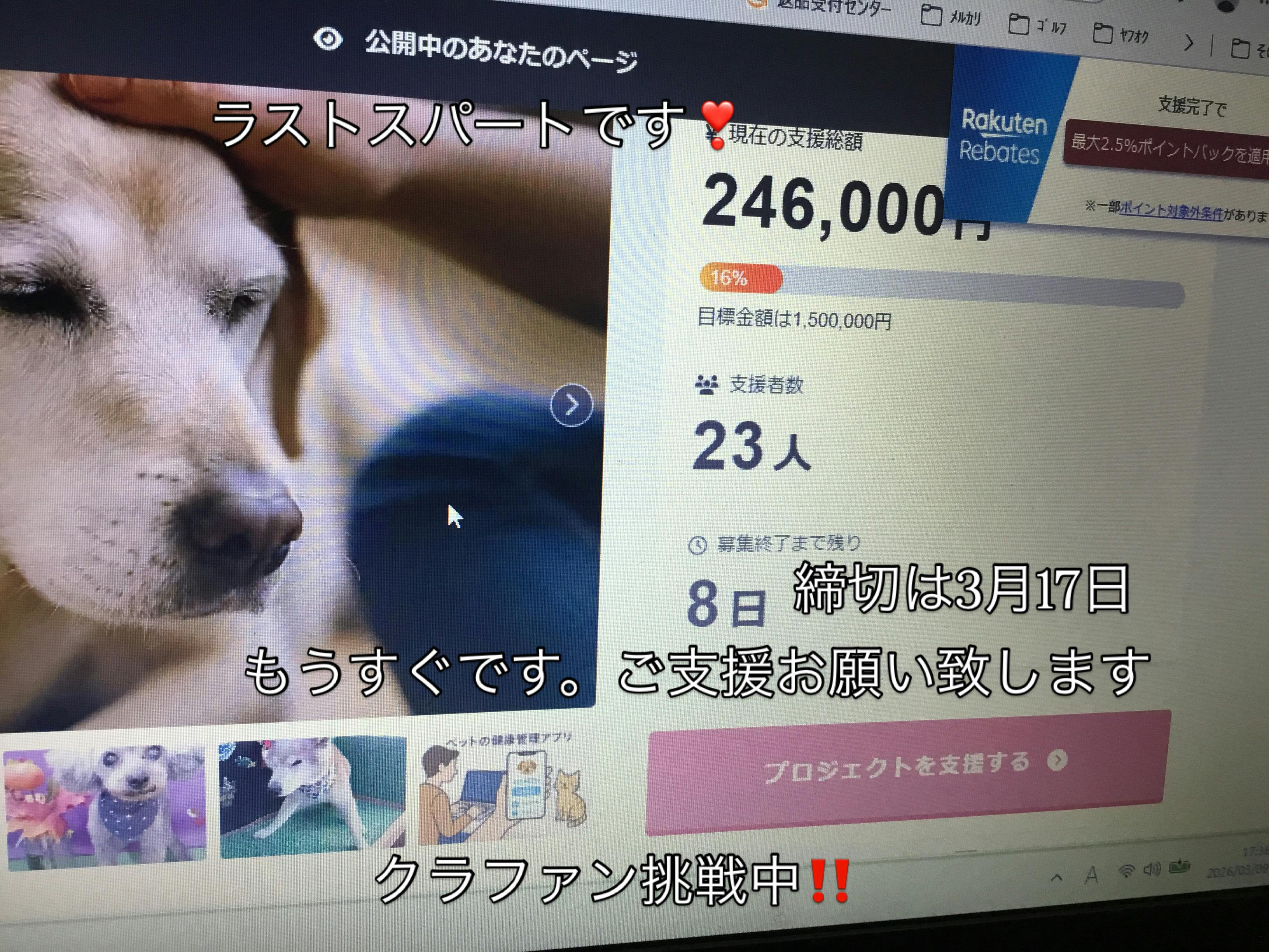 2026/03/09 18:04こんばんは、おせわになります。いよいよラストスパートとなってきました。最終が、3月17日なので あと8日カウントダウンの始まりです。ここまで、ご支援いただきました皆様に、本当に感謝申し上げます。ありがとうございます。しかし、まだまだ足りません。引き続き、皆様、ご支援をよろしくお願いいたします。まだ躊躇されている方も、出来るだけ よろしくお願いいたします。お早めにお願いいたします。ところで、昨日心配しておりました くっきーさん今日は、日中 日が差し込んできたので それを発見するやその小さな形に体を合わせて お昼寝 いつも通りで 一安心でした。今日もお読みいただきありがとうございました。 もっと見る老犬には波があります
