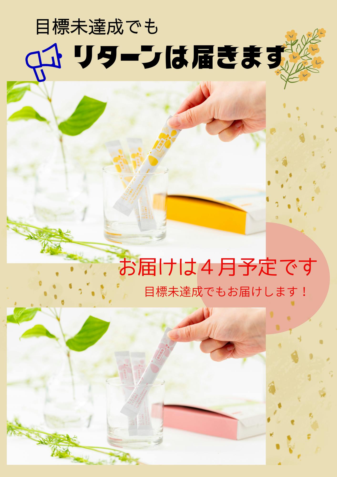 2026/02/05 11:16こんにちは!「ととのいフローラ」プロジェクトをご覧いただきありがとうございます。クラウドファンディングが初めての方から、「目標に届かなかったらどうなるの?」「支援しても届く?」というご質問をいただくことがあります。本プロジェクトは All-in方式 のため、目標金額に届かなかった場合でもプロジェクトは実行され、リターンはお届けします。安心してご参加いただけたら嬉しいです。また、お届けは 2026年4月予定 です。準備が整い次第、順次発送いたします。■リターンで迷ったら…・まず試したい方:7包トライアル(約1週間目安)・迷ったらここ:30包×1(約1ヶ月目安)・しっかり続けたい方:3箱セット(約3ヶ月目安)もしよろしければ、SNSシェアで応援していただけると嬉しいです。あなたの1シェアが次の支援のきっかけになります!「“ととのい習慣”を全国へ。ととのいフローラのクラファン応援お願いします!」※プロジェクトURL:https://camp-fire.jp/projects/914442/view?utm_campaign=cp_po_share_c_msg_mypage_projects_show もっと見る