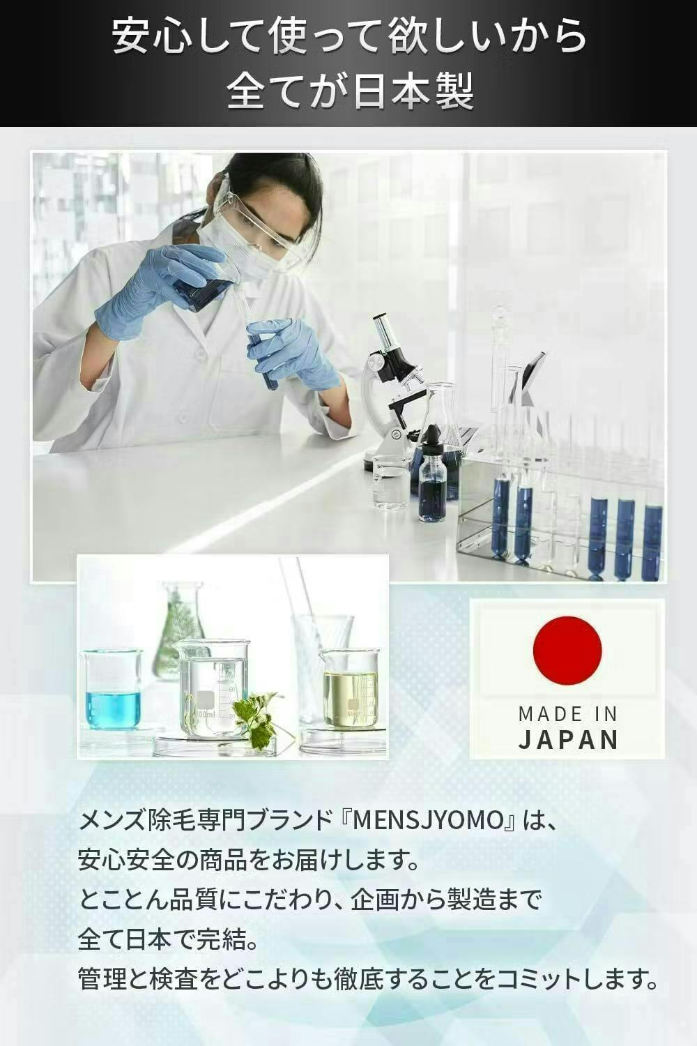 こうして誕生した「MENSJYOMO BLACK」は、私たちの夢と努力の結晶です。敏感肌の方にも安心して使っていただけるよう、天然成分、特に黒炭にこだわり、厳しい品質管理を行っています。肌に優しいのに、しっかりとした除毛効果を実感していただけることでしょう。