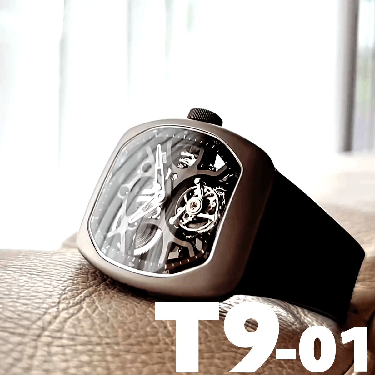ZEROO T9-02はT9・T9-01と同じトノーケースをベースに、9時位置トゥールビヨンとUFO軌跡フレームでダイアル表情を刷新した、100本限定のコレクタブルモデルです。スケルトン表現を一段深化させ、側面ガラス小窓と曲線美が宇宙的な存在感を放ちます。
