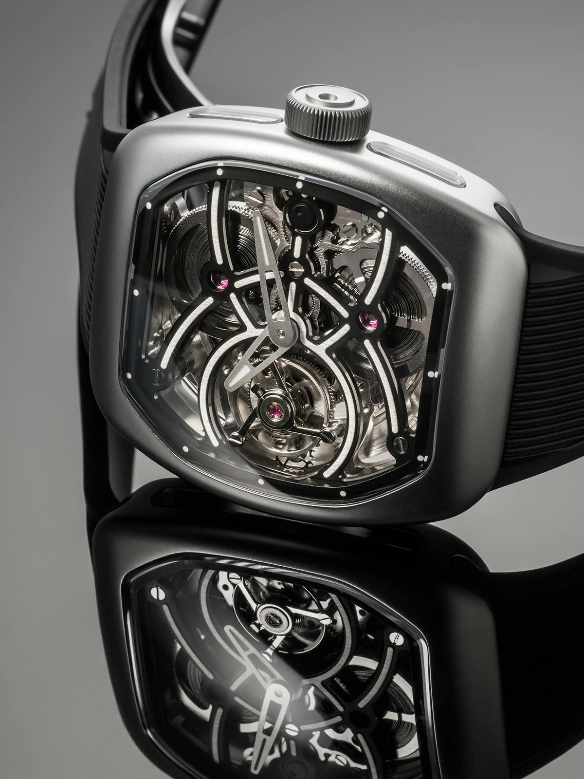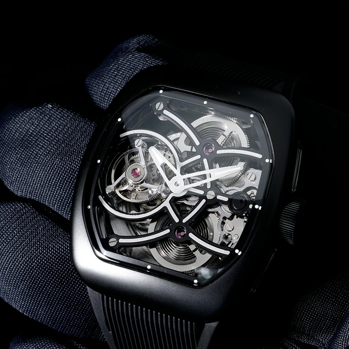 T4で培ってきたトゥールビヨンを極限まで見せるスケルトン表現。T9で到達した、新世代トノーケースの曲線美と装着感。T9-02は、この二つを同時に成立させることができるのかを確かめるために生まれた、挑戦的なモデルです。