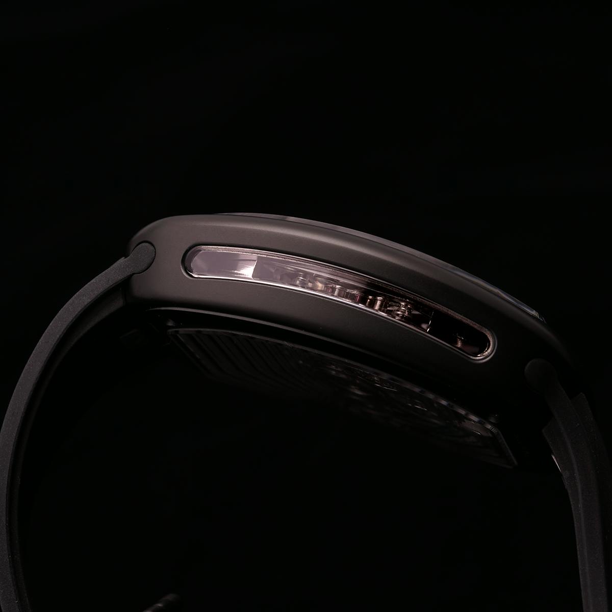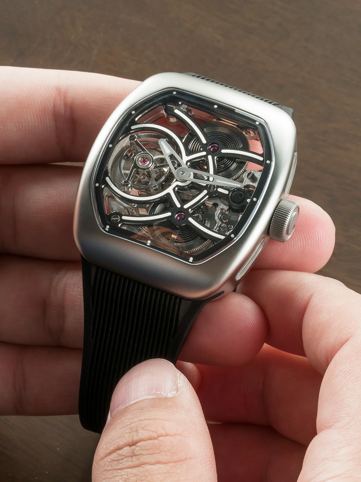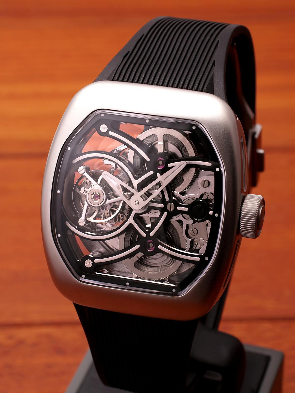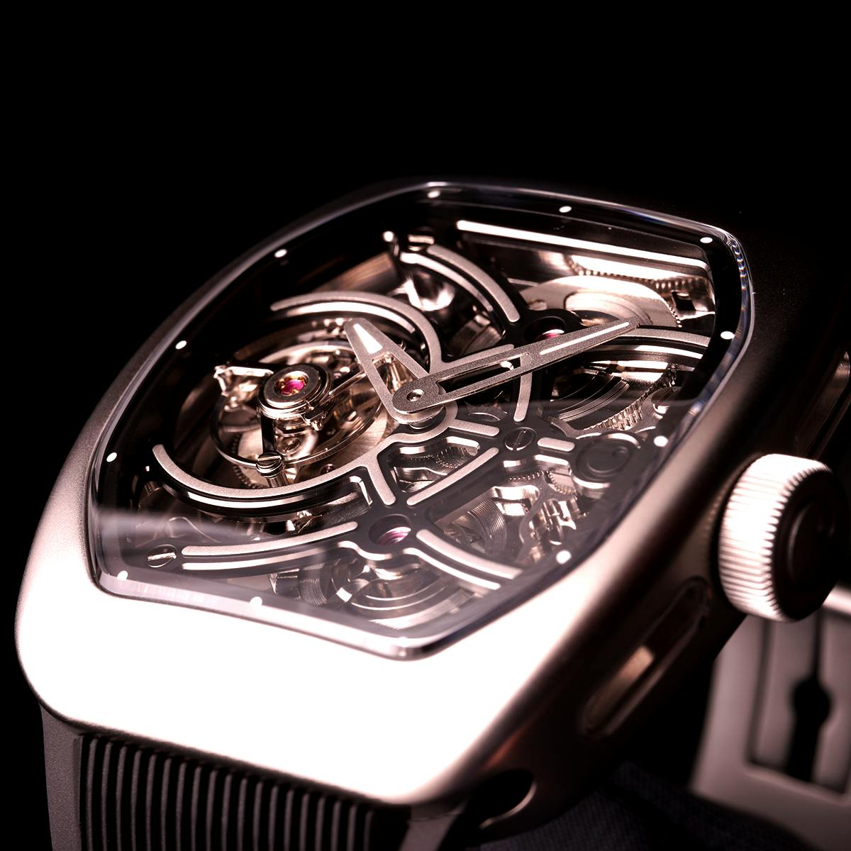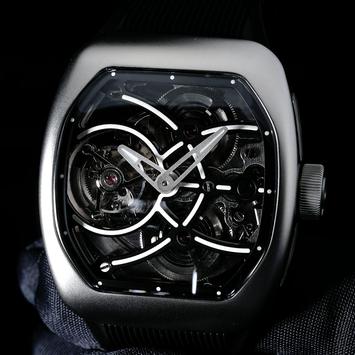 T4で培ってきたトゥールビヨンを極限まで見せるスケルトン表現。T9で到達した、新世代トノーケースの曲線美と装着感。T9-02は、この二つを同時に成立させることができるのかを確かめるために生まれた、挑戦的なモデルです。