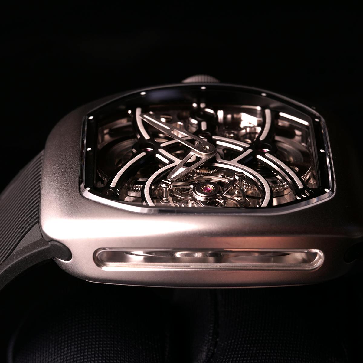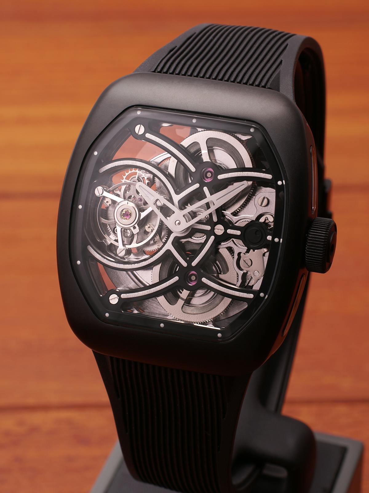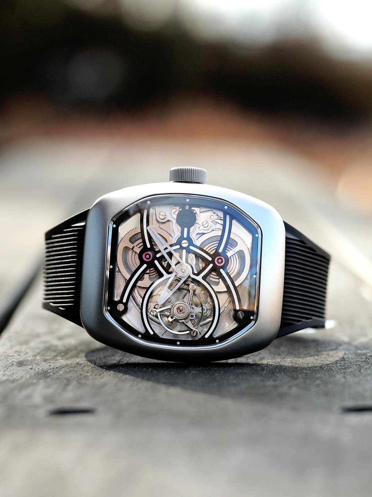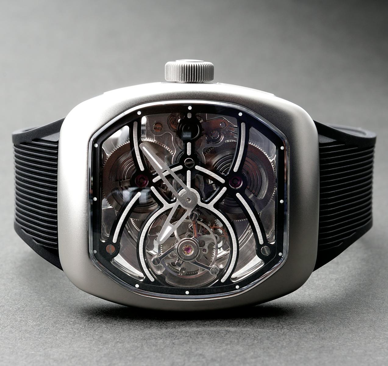T4で培ってきたトゥールビヨンを極限まで見せるスケルトン表現。T9で到達した、新世代トノーケースの曲線美と装着感。T9-02は、この二つを同時に成立させることができるのかを確かめるために生まれた、挑戦的なモデルです。