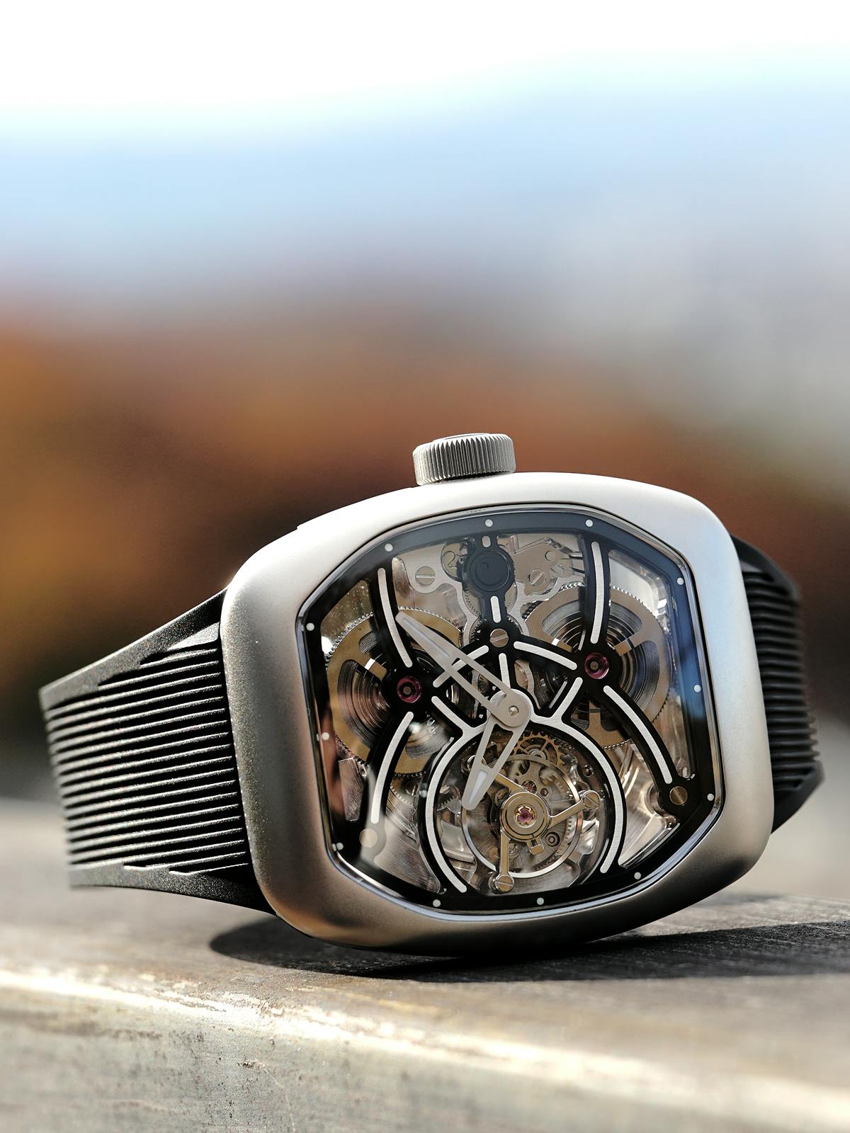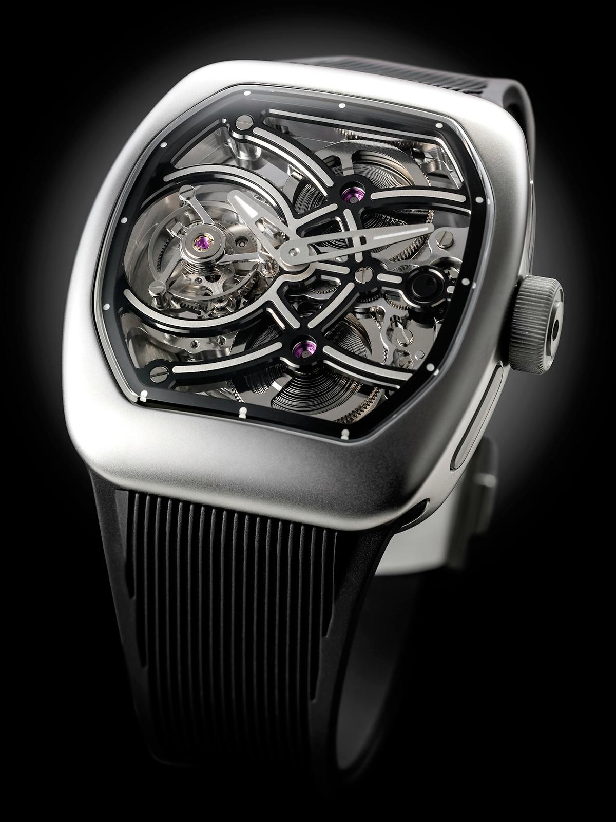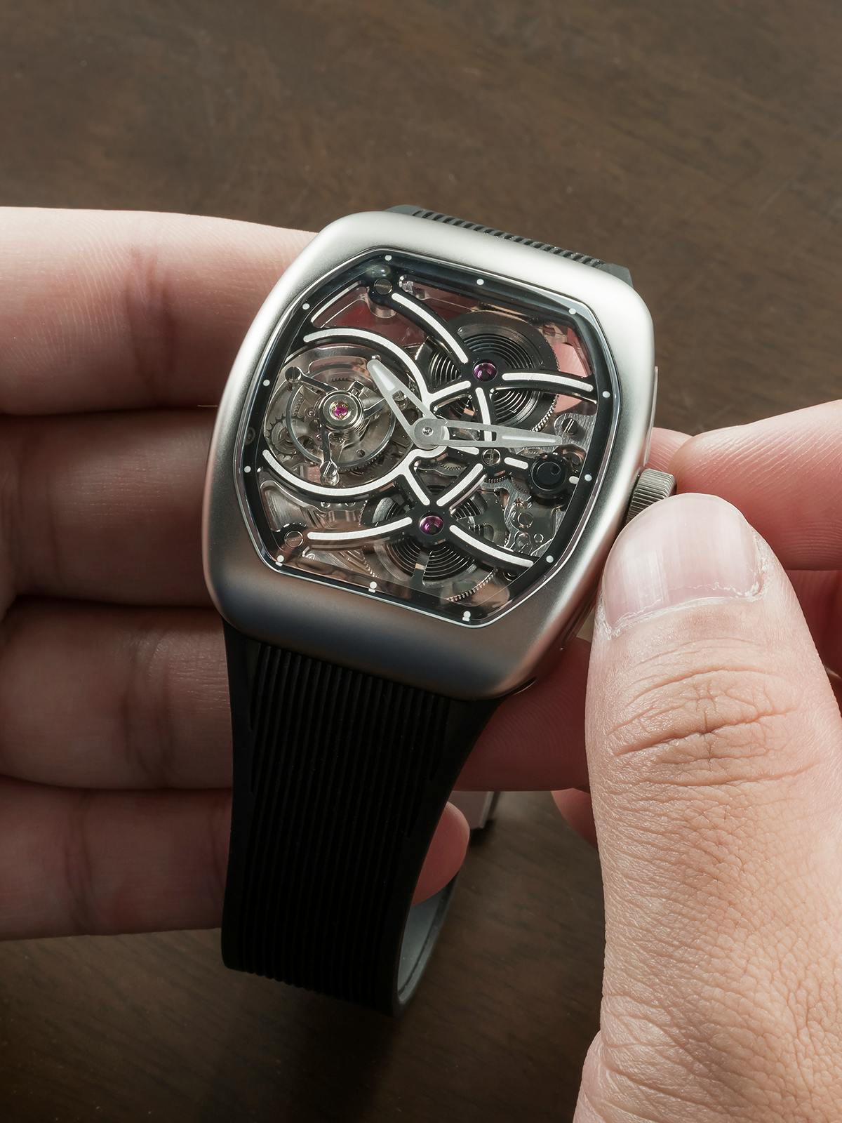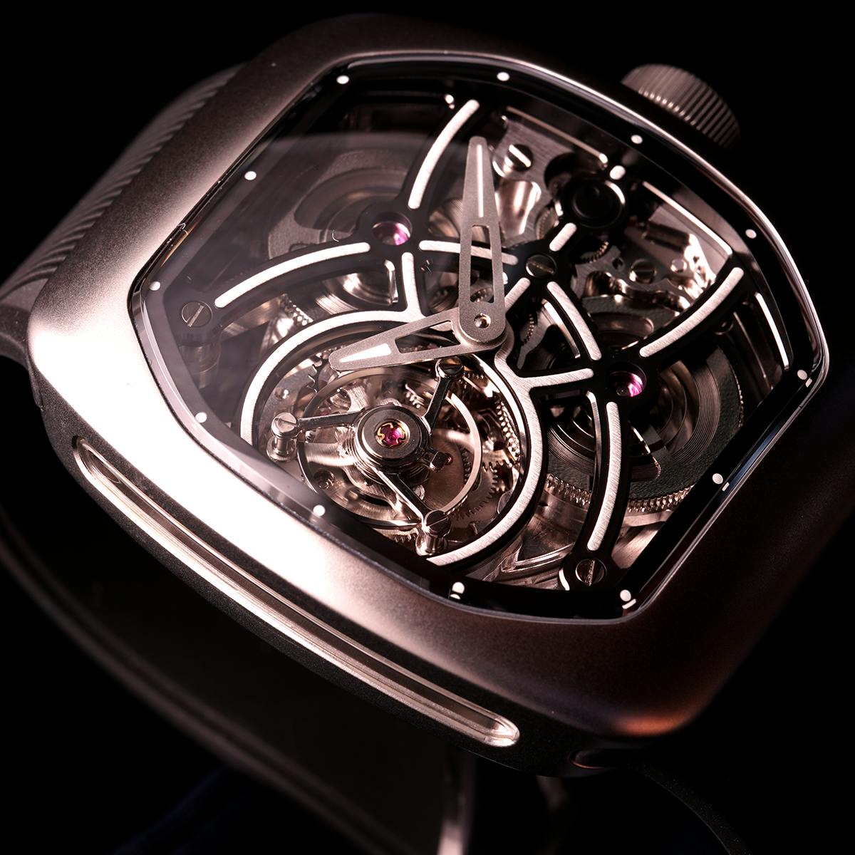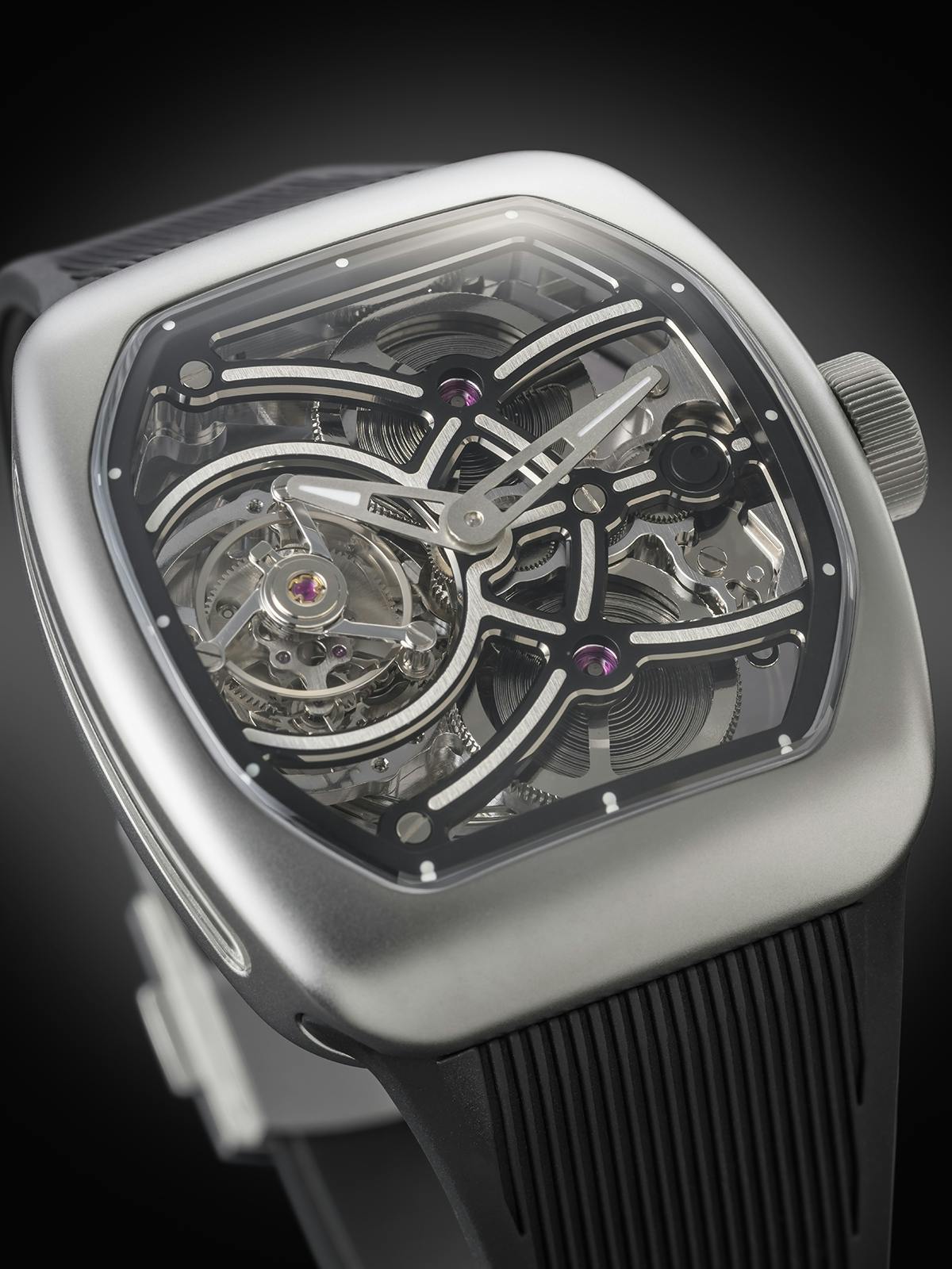 T4で培ってきたトゥールビヨンを極限まで見せるスケルトン表現。T9で到達した、新世代トノーケースの曲線美と装着感。T9-02は、この二つを同時に成立させることができるのかを確かめるために生まれた、挑戦的なモデルです。