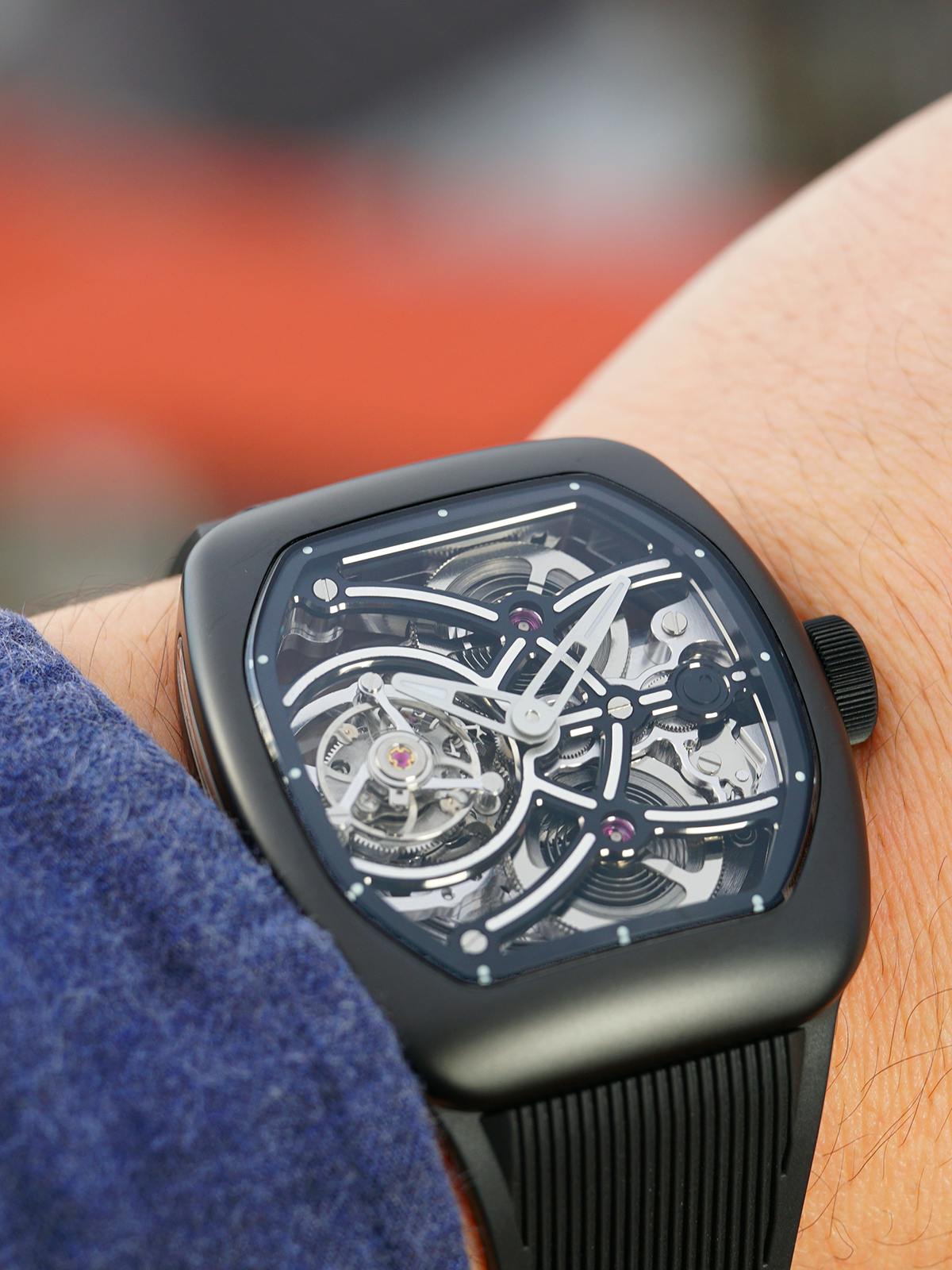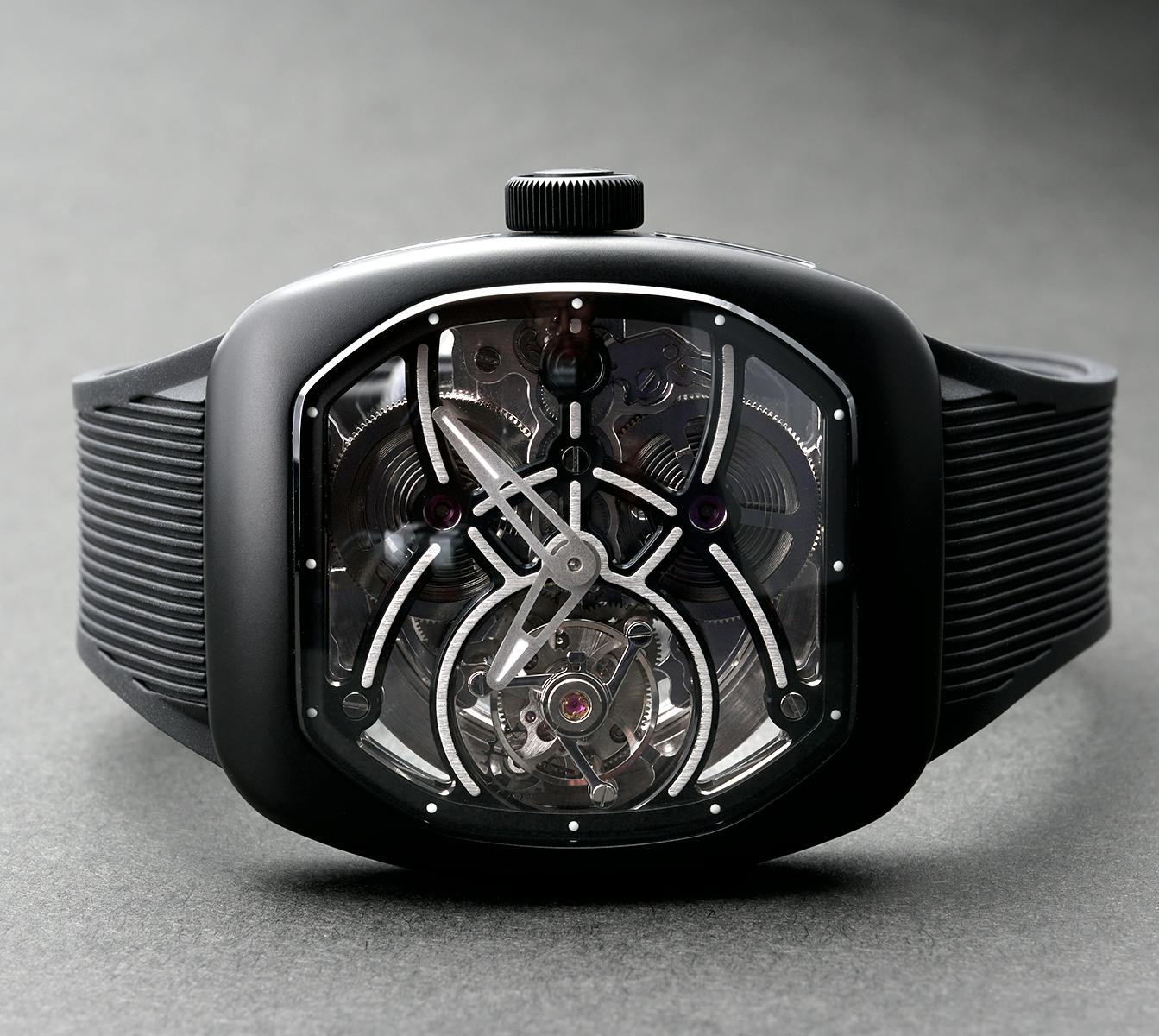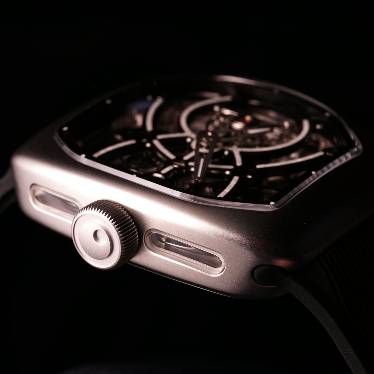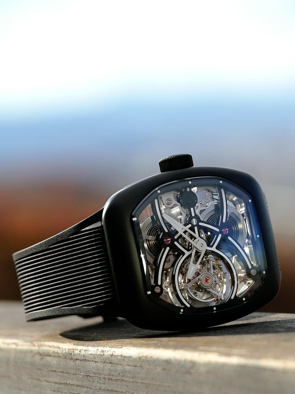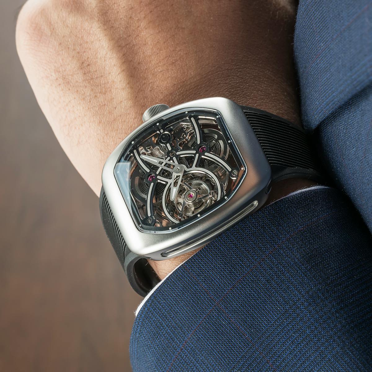T4で培ってきたトゥールビヨンを極限まで見せるスケルトン表現。T9で到達した、新世代トノーケースの曲線美と装着感。T9-02は、この二つを同時に成立させることができるのかを確かめるために生まれた、挑戦的なモデルです。