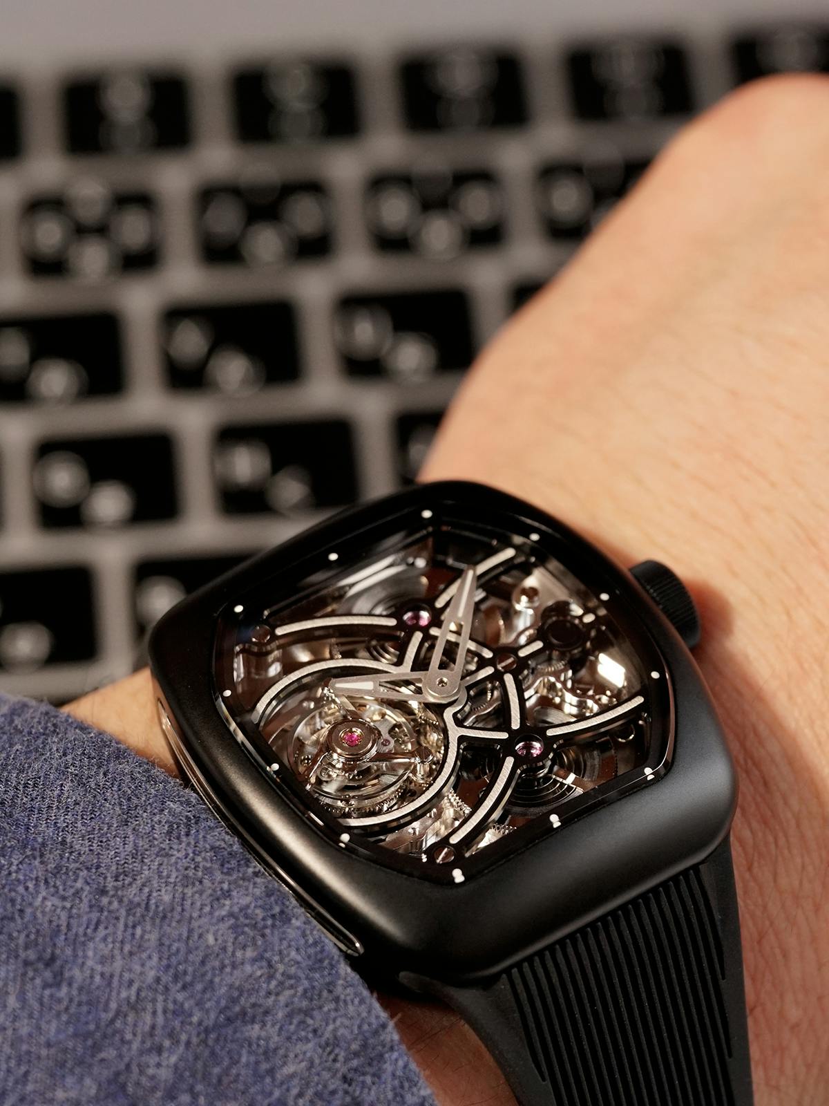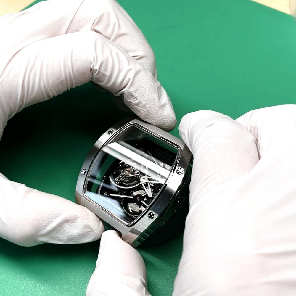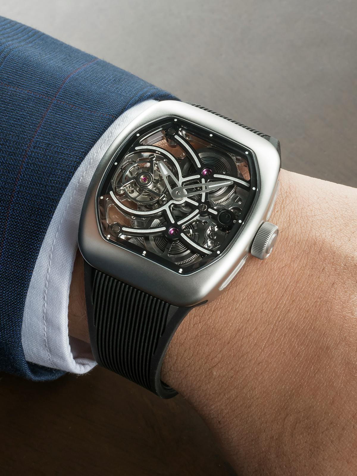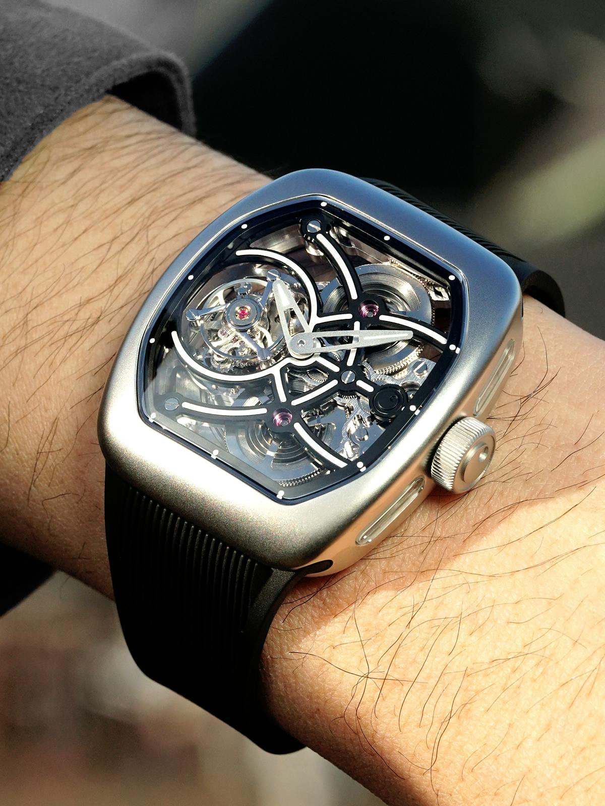 T4で培ってきたトゥールビヨンを極限まで見せるスケルトン表現。T9で到達した、新世代トノーケースの曲線美と装着感。T9-02は、この二つを同時に成立させることができるのかを確かめるために生まれた、挑戦的なモデルです。