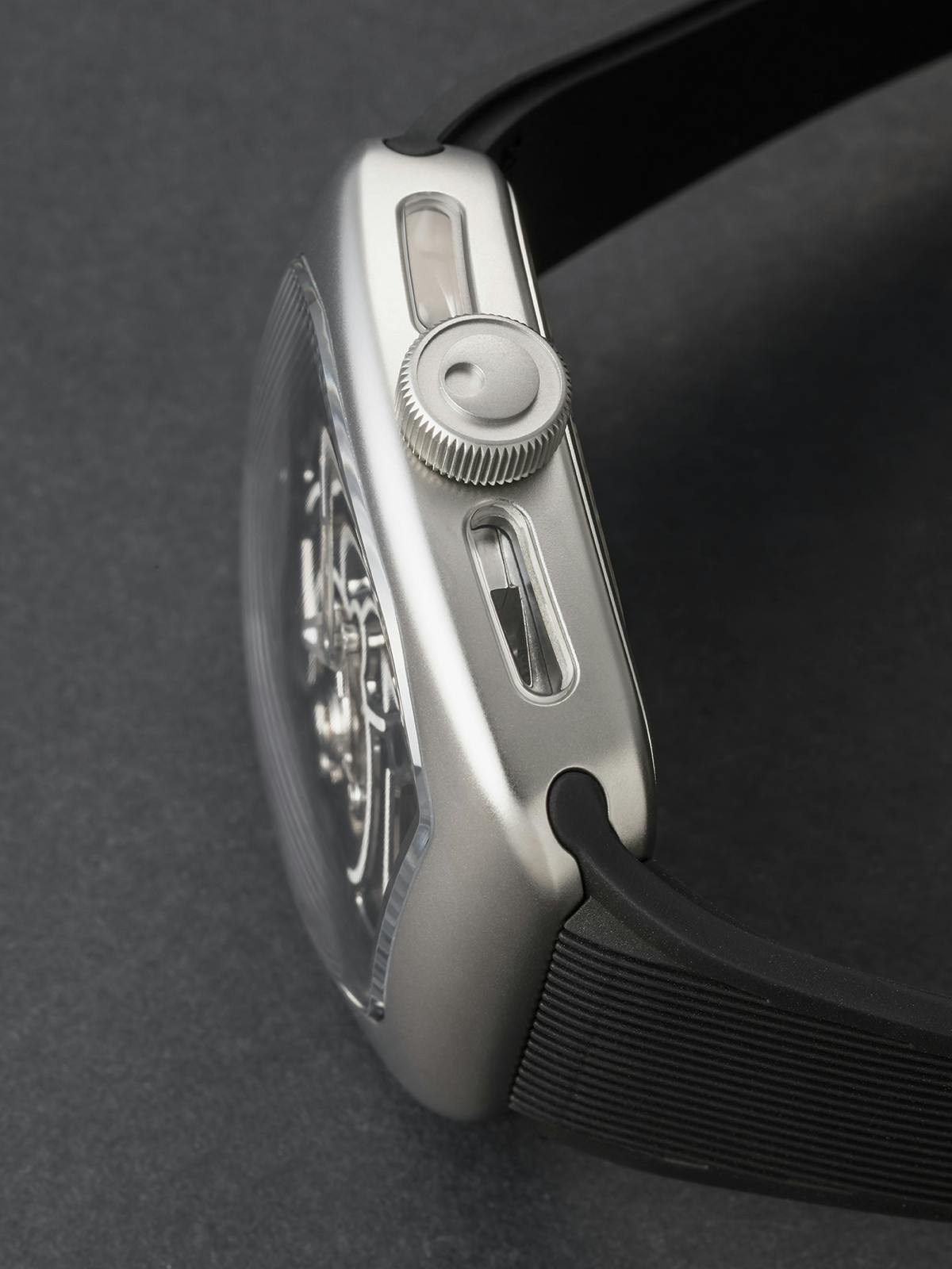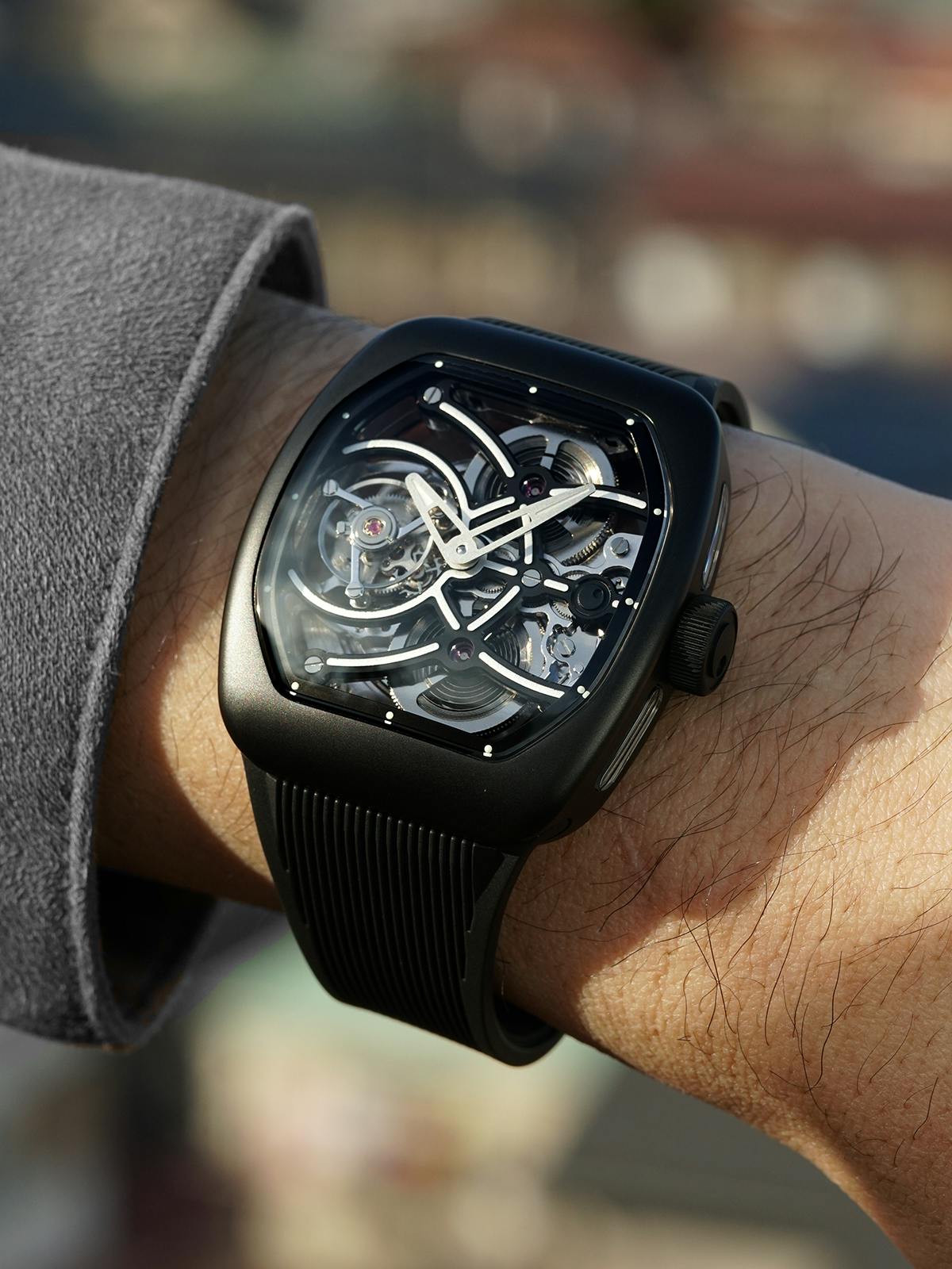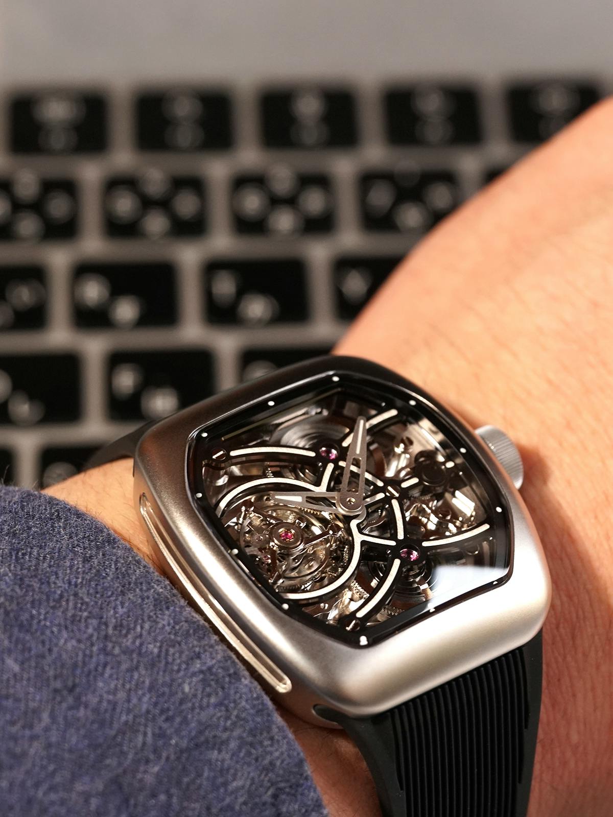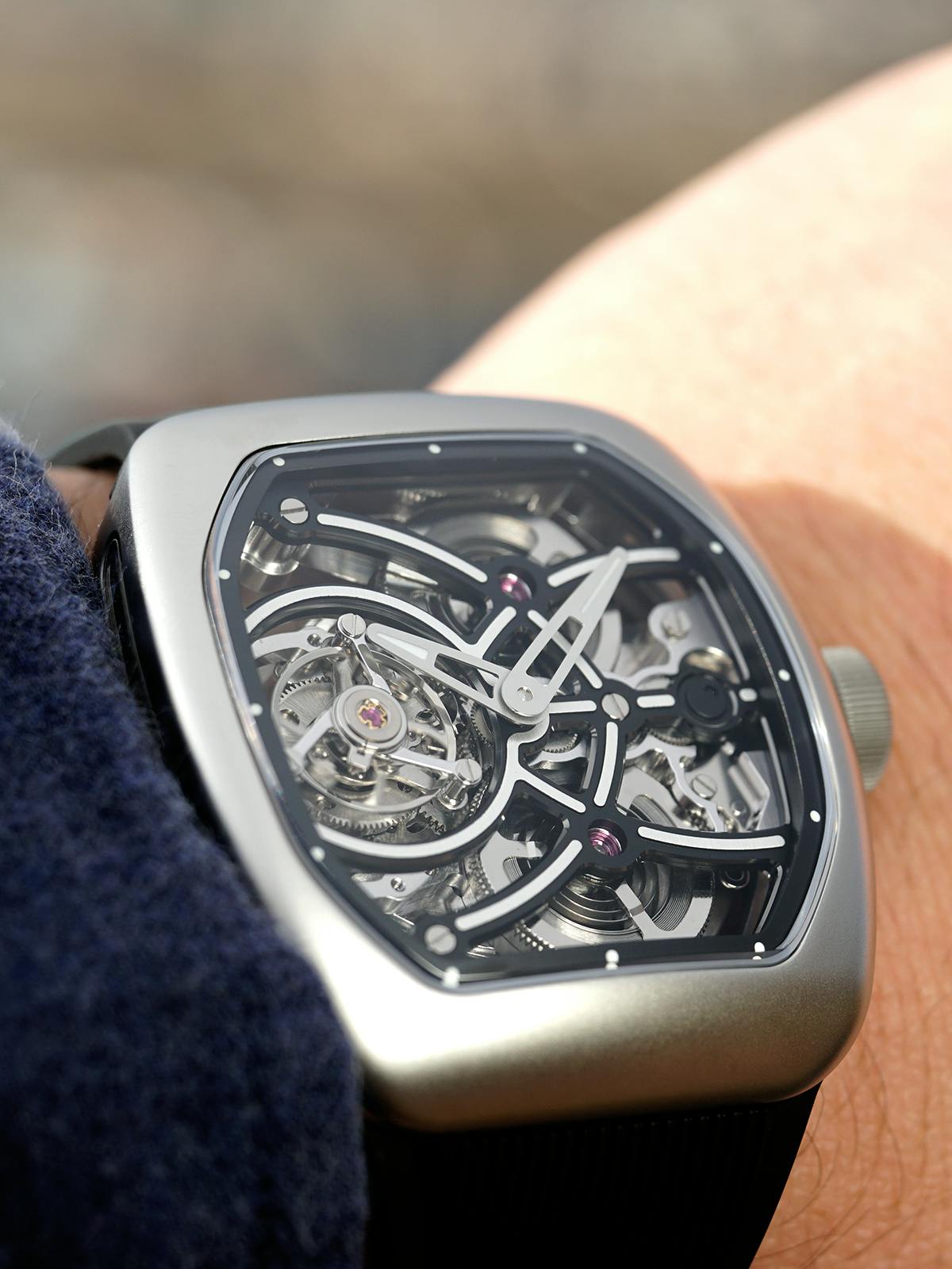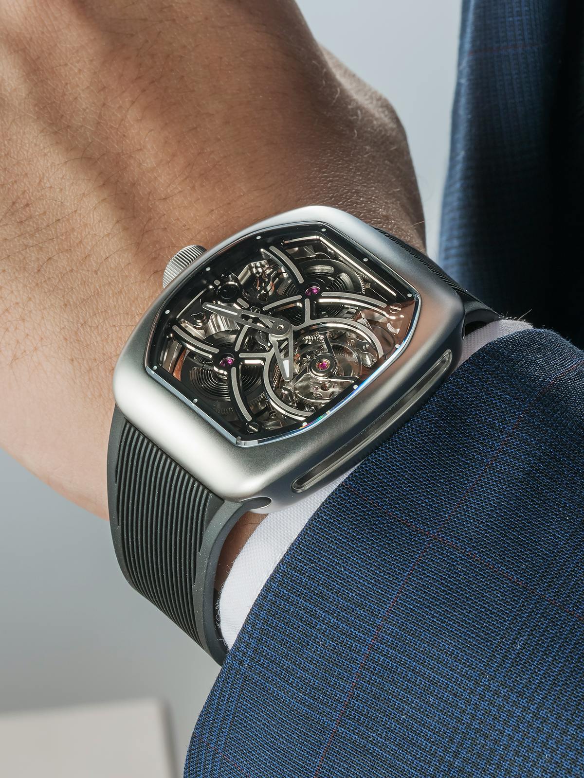 T4で培ってきたトゥールビヨンを極限まで見せるスケルトン表現。T9で到達した、新世代トノーケースの曲線美と装着感。T9-02は、この二つを同時に成立させることができるのかを確かめるために生まれた、挑戦的なモデルです。