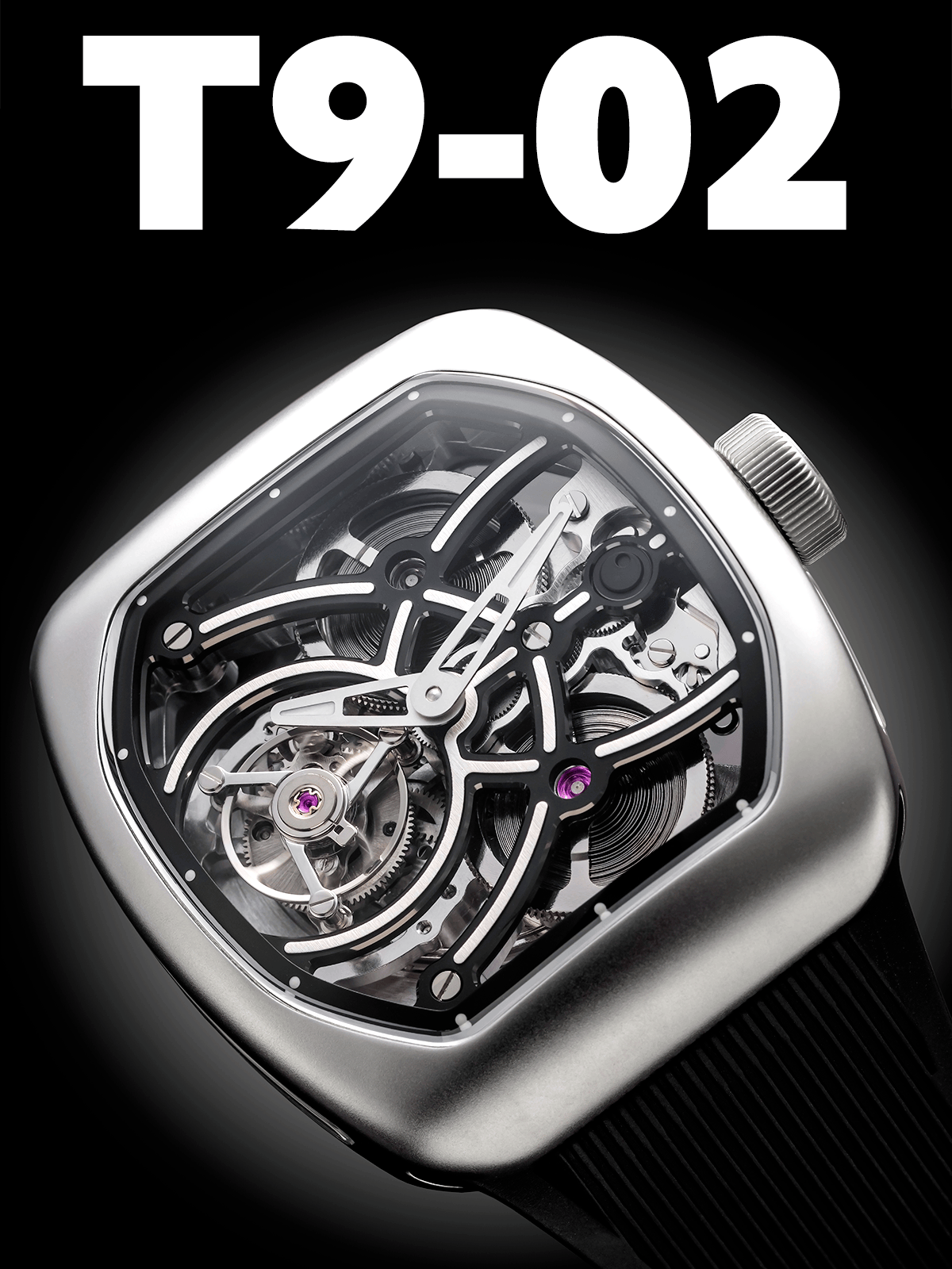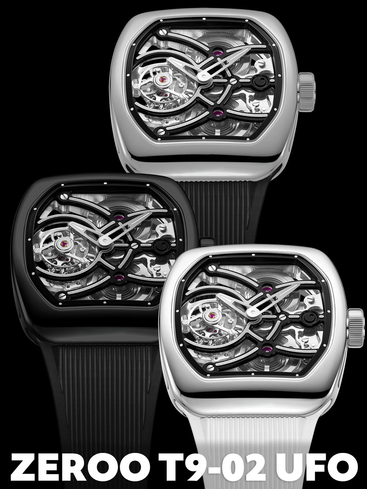 ZEROO T9-02はT9・T9-01と同じトノーケースをベースに、9時位置トゥールビヨンとUFO軌跡フレームでダイアル表情を刷新した、100本限定のコレクタブルモデルです。スケルトン表現を一段深化させ、側面ガラス小窓と曲線美が宇宙的な存在感を放ちます。