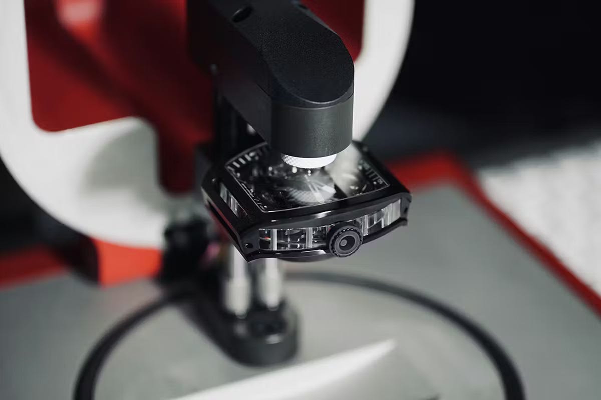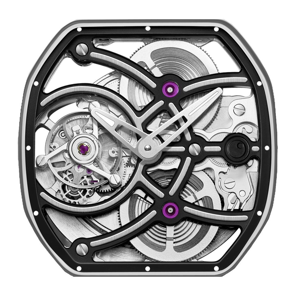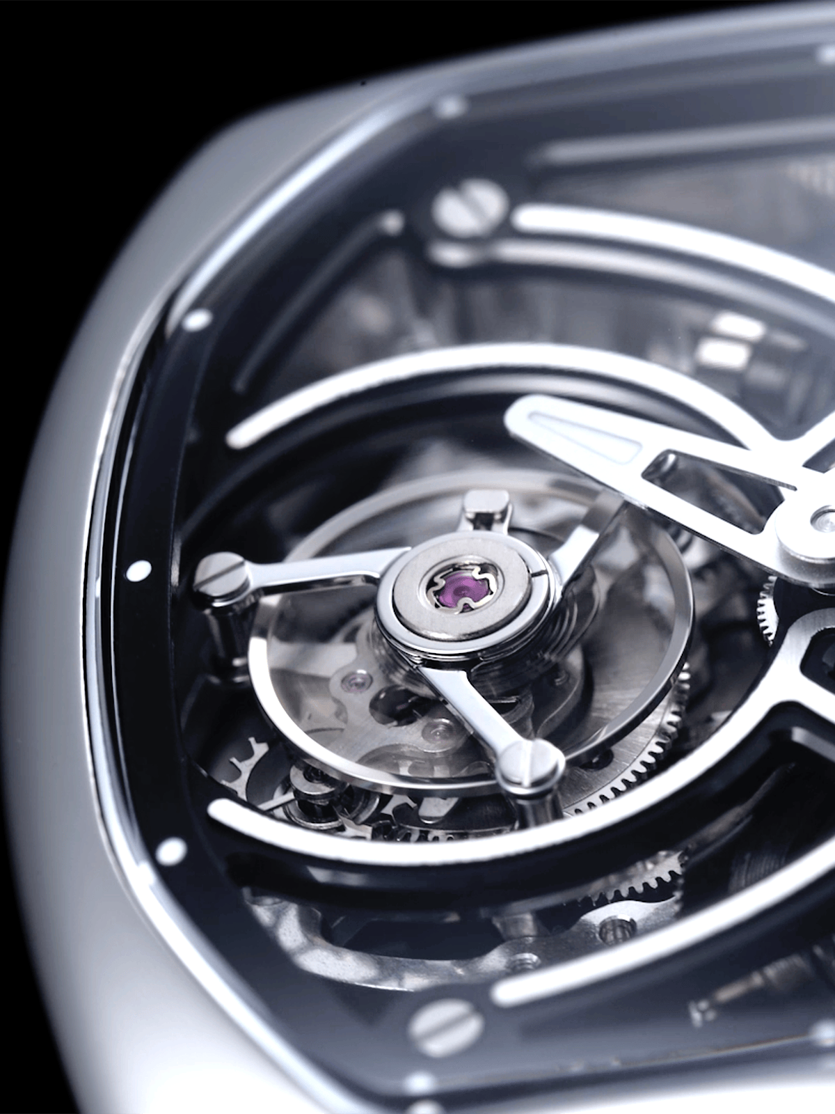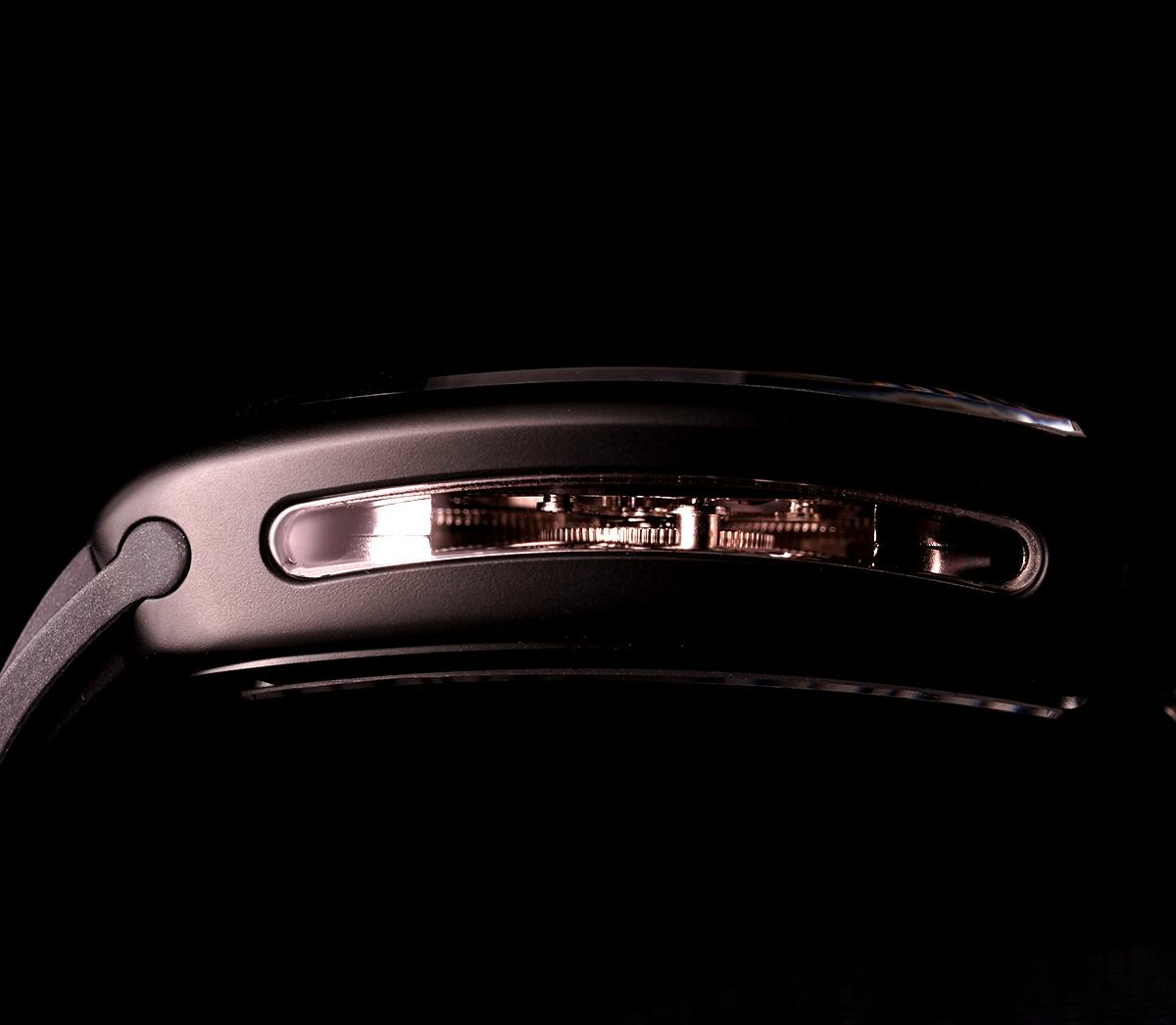 単にムーブメントを固定するだけでなく、歯車の回転やトゥールビヨンキャリッジの動きをなぞるように存在し、機構の躍動を可視化する「軌跡」として設計されています。まるで機構の重力圏を滑るように巡る、観測体のような存在です。