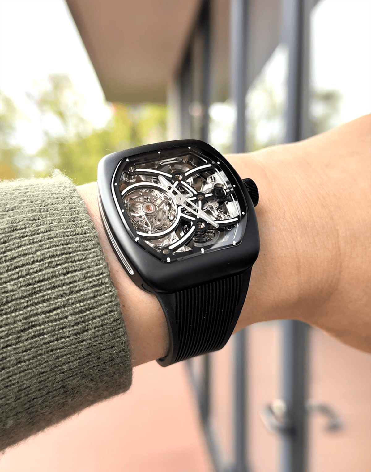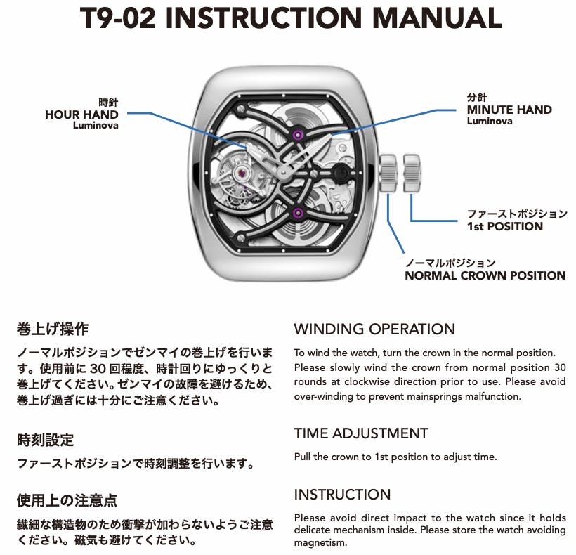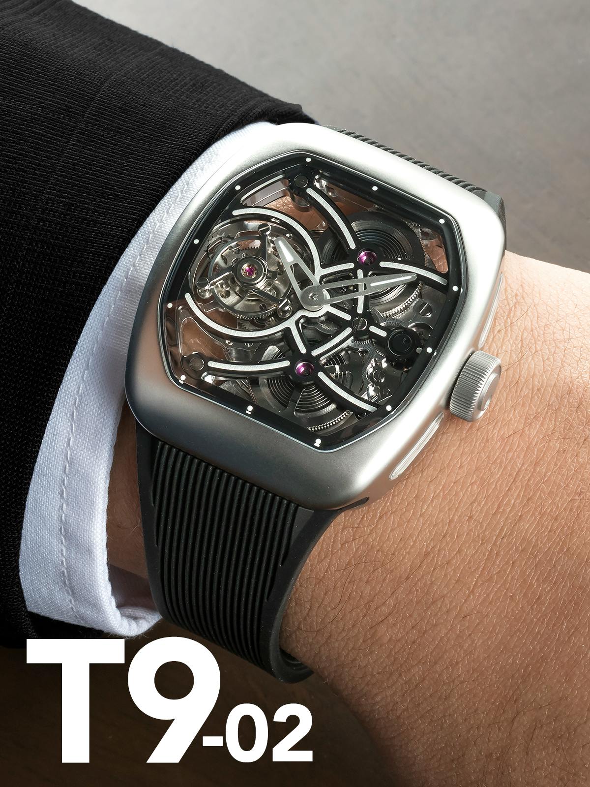 T9-02は、T9シリーズの設計思想をそのままに、スケルトン表現をどこまで突き詰められるかという問いに対する、現時点での我々の最終回答です。同じケース、同じサイズ感、同じ装着感の中で、これ以上ムーブメントを見せることはできない。その限界点を見極めた上で設計されたのがT9-02です。