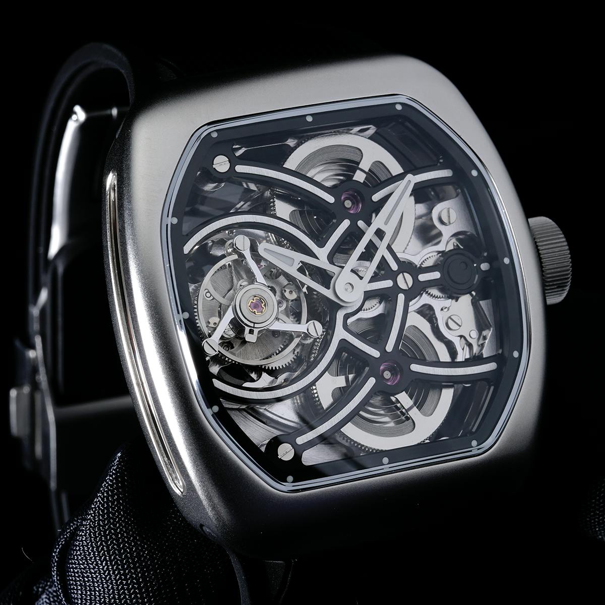 T4で培ってきたトゥールビヨンを極限まで見せるスケルトン表現。T9で到達した、新世代トノーケースの曲線美と装着感。T9-02は、この二つを同時に成立させることができるのかを確かめるために生まれた、挑戦的なモデルです。