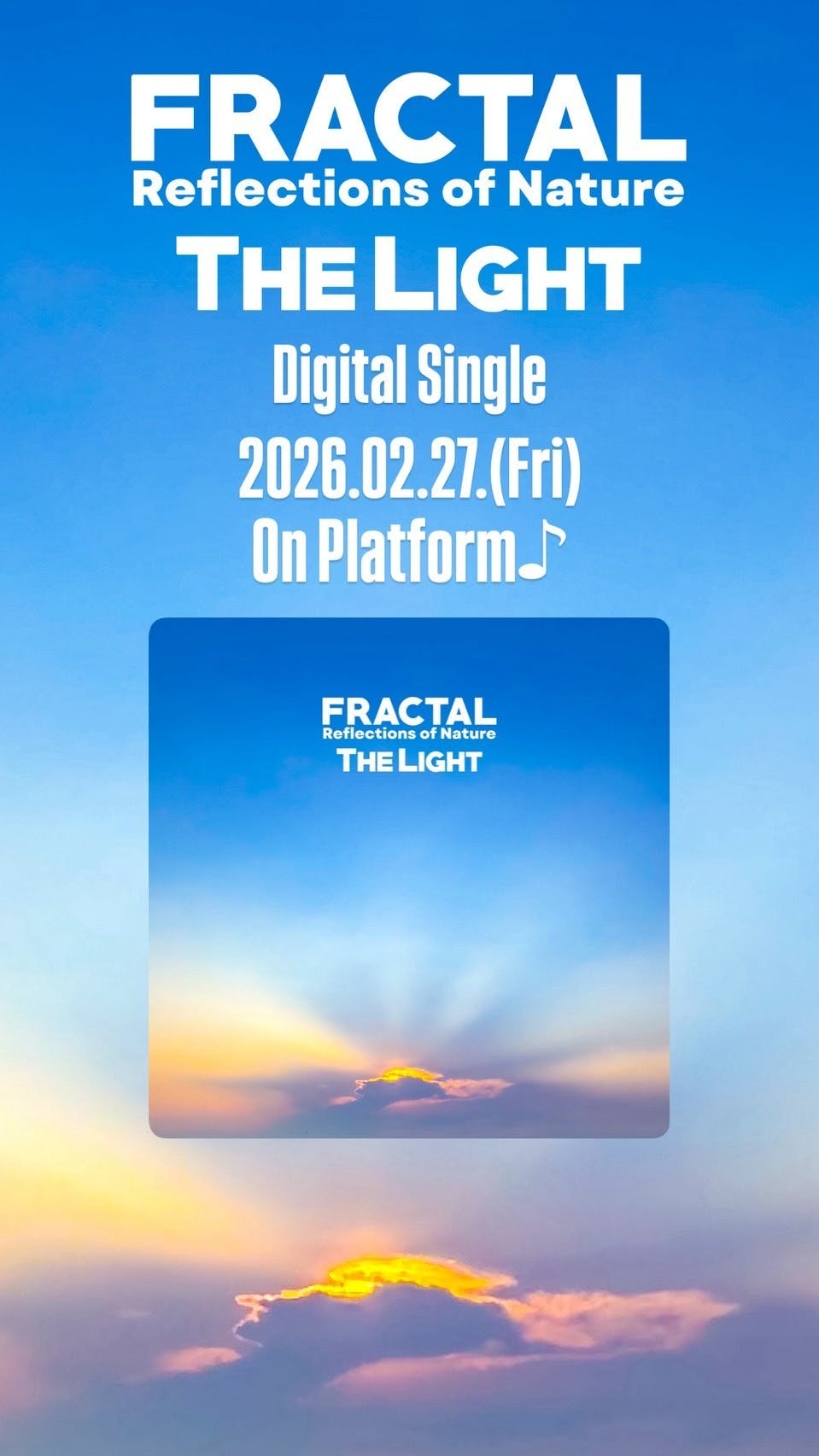 クラウドファンディング「XBS新章|EP『FRACTAL』制作プロジェクト」へのご支援、誠にありがとうございます。EP『FRACTAL Reflections of Nature』より、先行シングル 「The Light」 が2月27日 0:00よりデジタル配信スタートいたします。本楽曲は、“すべてはつながり、循環している”という『FRACTAL』の世界観を象徴する一曲です。これまでの経験や出会い、そして現在へと続く流れを音楽として形にした、今回のプロジェクトを語るうえでも重要な作品となっています。ぜひ配信開始とともに聴いていただき、感じたことをSNSなどでシェアしていただけましたら嬉しいです。⸻■ 配信プラットフォームhttps://linkco.re/etrHevYA⸻引き続き、EP『FRACTAL』完成に向けて制作は進んでいます。今後も最新情報を活動報告にてお届けしてまいりますので、どうぞよろしくお願いいたします。