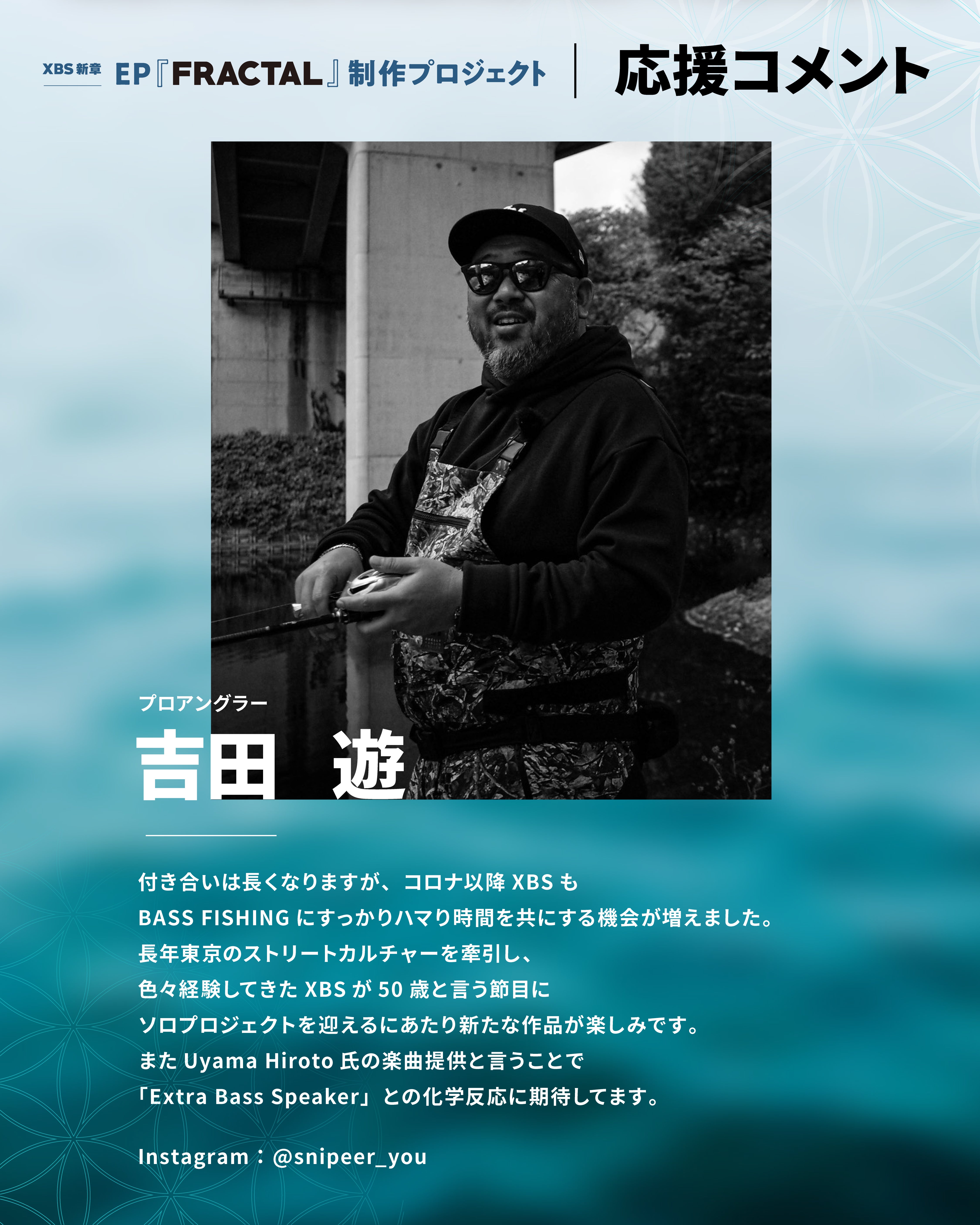 クラウドファンディング「XBS新章|EP『FRACTAL』制作プロジェクト」へのご支援、誠にありがとうございます。日本のバスフィッシング界を代表するプロアングラー吉田 遊さんから応援メッセージをいただきました。吉田さんのフィッシングブランド【SNIPEER(スナイパー)】と手掛けたリターンも必見です。プロジェクトは 2月28日まで 続きます。引き続き制作を進めながら、活動報告にて進捗や裏側もお伝えしていく予定です。今後とも応援・拡散のほど、よろしくお願いいたします。