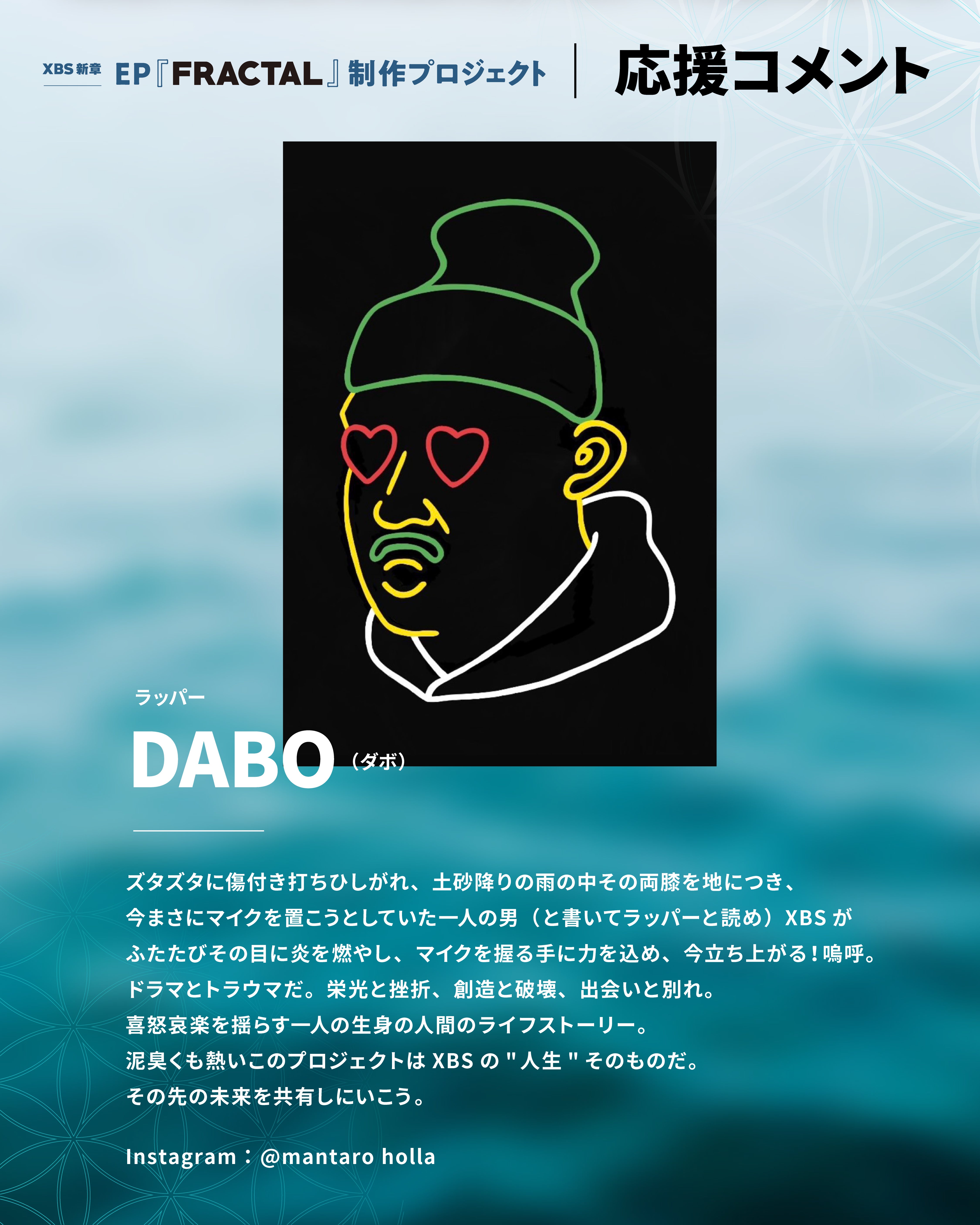 クラウドファンディング「XBS新章|EP『FRACTAL』制作プロジェクト」へのご支援、誠にありがとうございます。NITRO MICROPHONE UNDERGROUNDのメンバーDABOさんから応援メッセージをいただきました。プロジェクトは 2月28日まで 続きます。引き続き制作を進めながら、活動報告にて進捗や裏側もお伝えしていく予定です。今後とも応援・拡散のほど、よろしくお願いいたします。