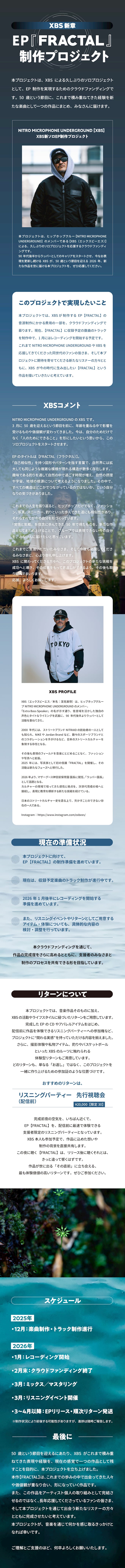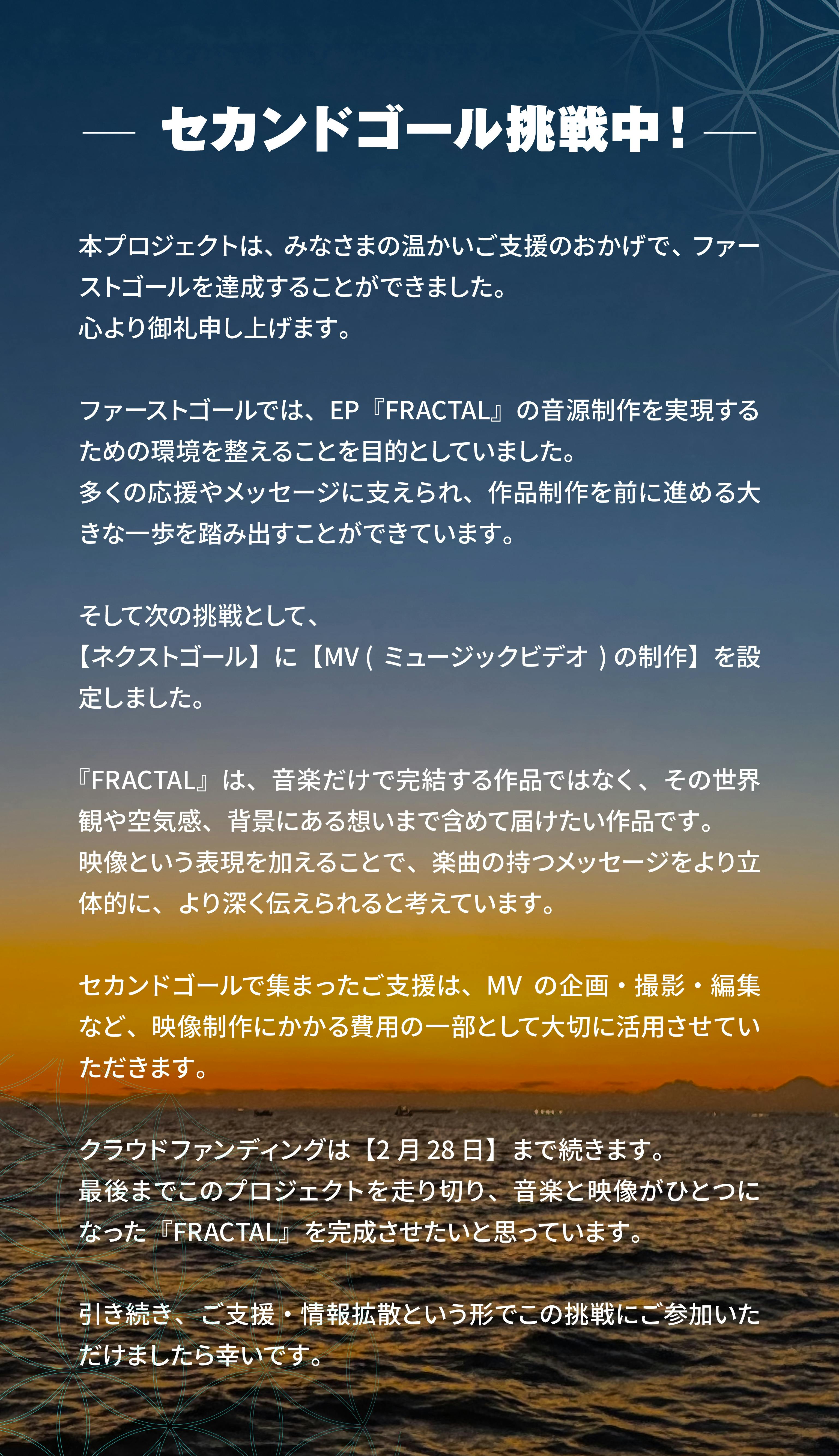 2026/01/22 16:05クラウドファンディング「XBS新章|EP『FRACTAL』制作プロジェクト」へのご支援、誠にありがとうございます。みなさまのご支援のおかげで、ファーストゴール【100万円】を達成することができました。本当にありがとうございます。EP『FRACTAL』の音源制作に向け、確かな一歩を踏み出すことができました。そして次の挑戦として、ネクストゴールに「MV制作」を設定しました。楽曲の世界観を映像として残すことで、この作品をより多くの方に、より深く届けたいと考えています。プロジェクトは 2月28日まで 続きます。引き続き、応援・シェアという形でもご参加いただけましたら幸いです。 もっと見る