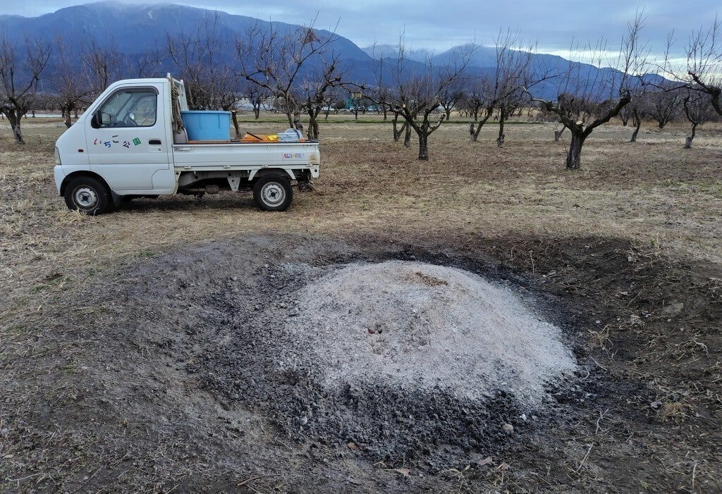 ④丸一日焼却した後の灰の山です。恰も「兵どもが夢の跡」の如しです。