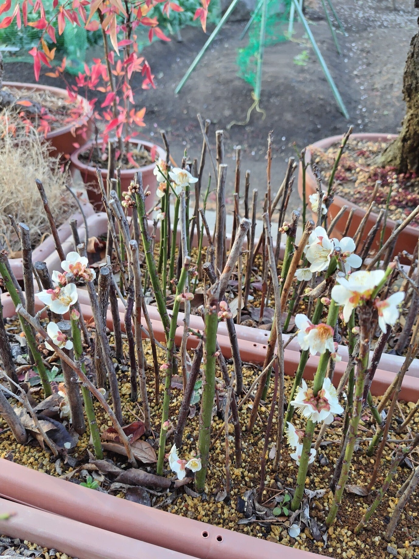 昨秋挿した南高梅。未だ発根して居るか如何かは分かりません。根が無くとも水分が有れば幹の力で花は咲きますし或る程度芽も出ます。出た芽が伸び始めると根も伸びて居る筈です。後2か月程で結果が出ます。