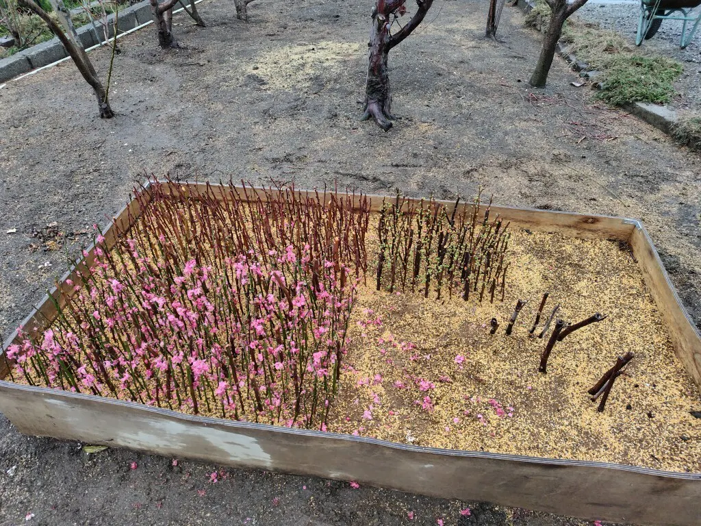 左上は黄金桃・其の手前は八重咲実紅梅・上の右はスモモ(樹種不明)です。