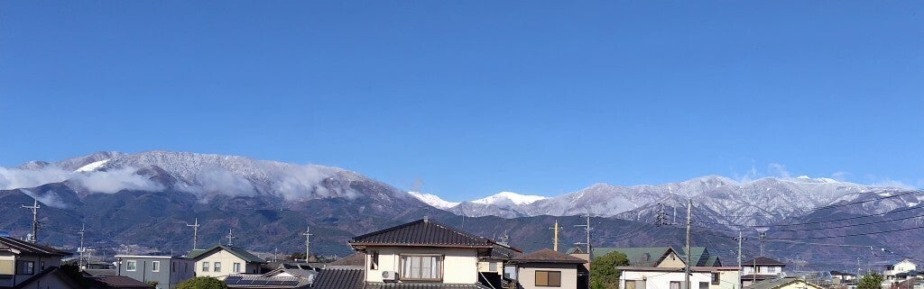 甲斐盆地は一昨日から昨夜迄少雨乍ら略一昼夜氷雨に見舞われた。自然は春の芽吹きの支度の雨。2,000m級の南アルプスの山々は春の淡雪。写真の中程の間ノ岳等の根雪の山々は別として其の手前の連山は流石に淡雪にして夕刻には略消えて終った。