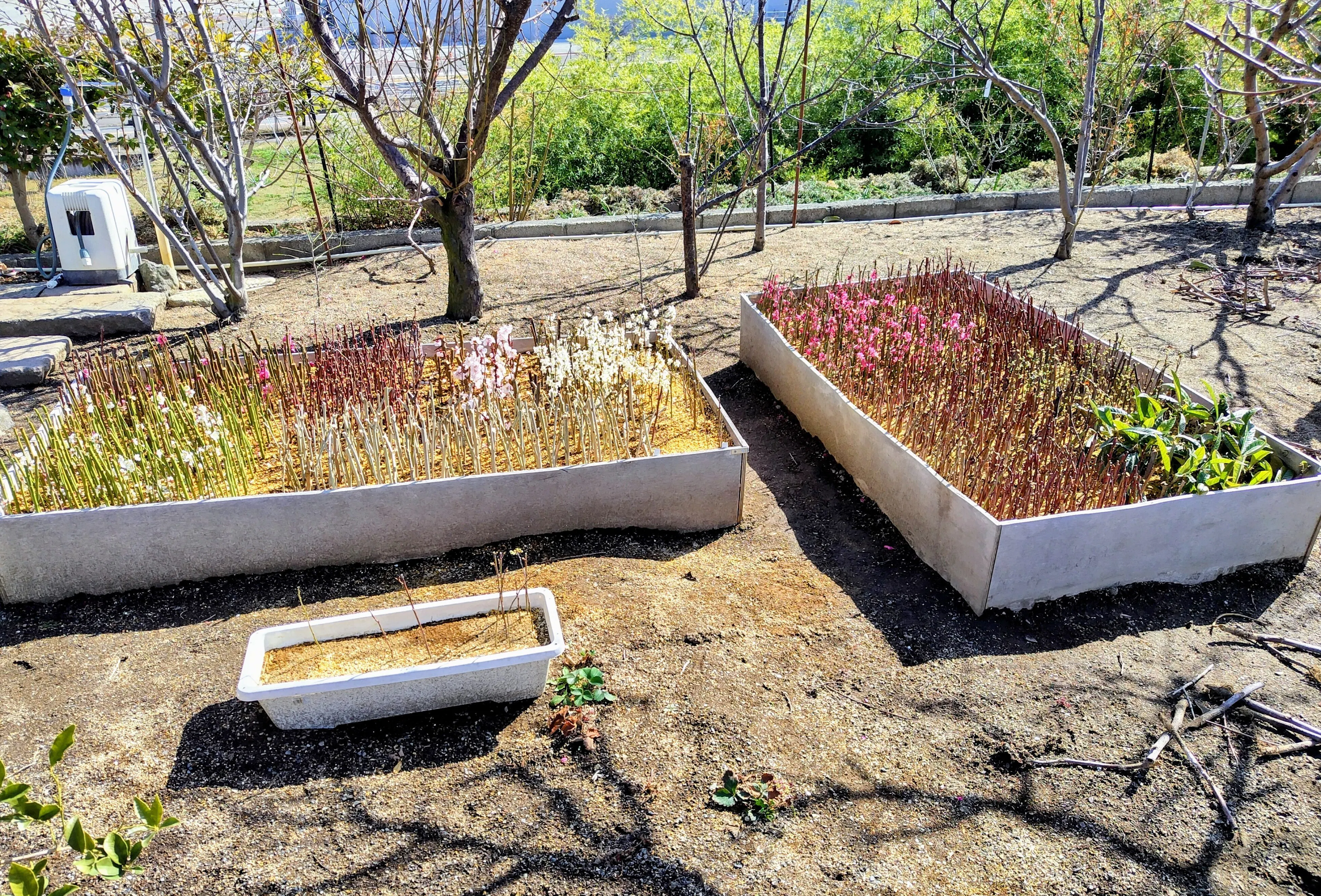 挿し木苗木床が2床完了しました。今年は春が随分早く遣って来ました。挿し木の時期としてはやや遅れ気味に成りました。花が咲く前が良かったかも知れません。頑張れー!と声を掛け乍ら少なくとも1カ月は毎日水遣りです。因みに手前のプランターの小さな木は昨秋挿した露茜と言う近年和歌山県で開発された新品種の梅です。小さい乍ら花が咲いて居ます。プランター一杯に70~80本挿して此れ丈が生き延びました。