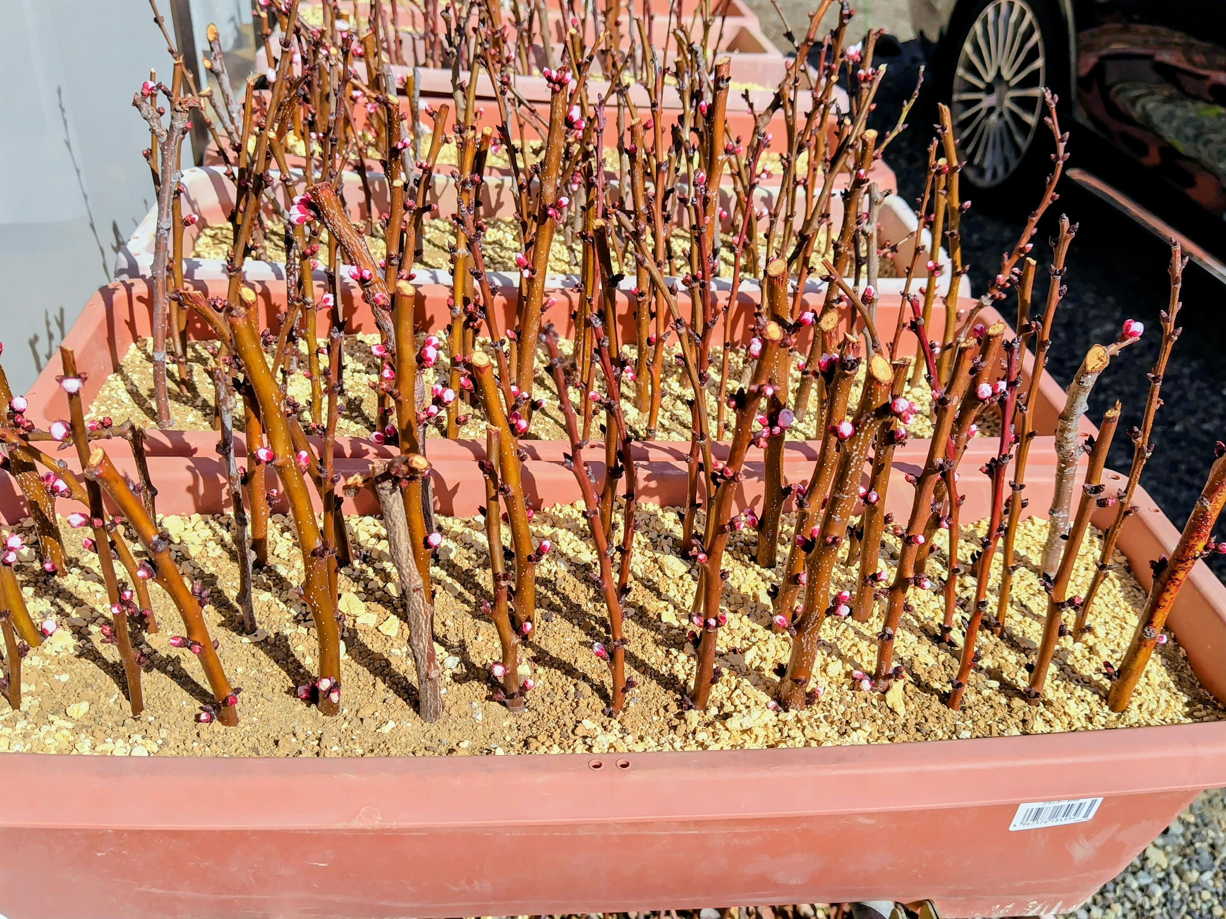 2026/03/06 06:08昨秋挿した杏です。花芽が沢山付きました。半年程生き延びました。此処迄でも駄目な物は幹が細って枯れて行きます。殆どが元気に春を迎えました。然し花の後に枝芽が付くか如何かが発根の境目です。此処迄は幹の力で生き延びましたが此れからは発根しないと枝芽が生長出来ません。枝芽が生長して来ると言う事は発根して居ると言う事に成ります。然う成れば略挿し木は成功です。 もっと見る