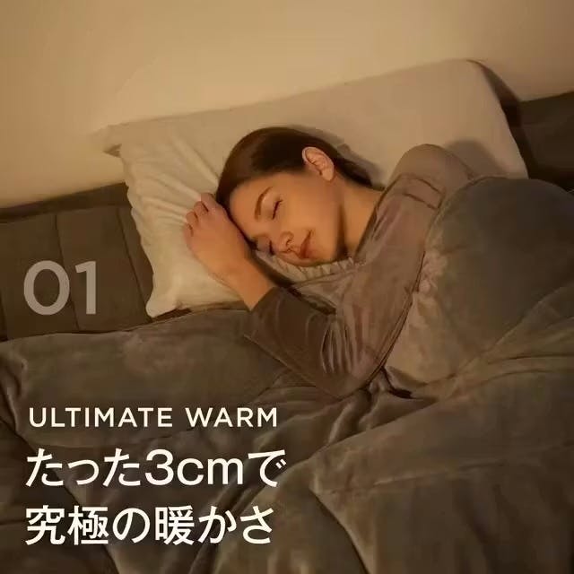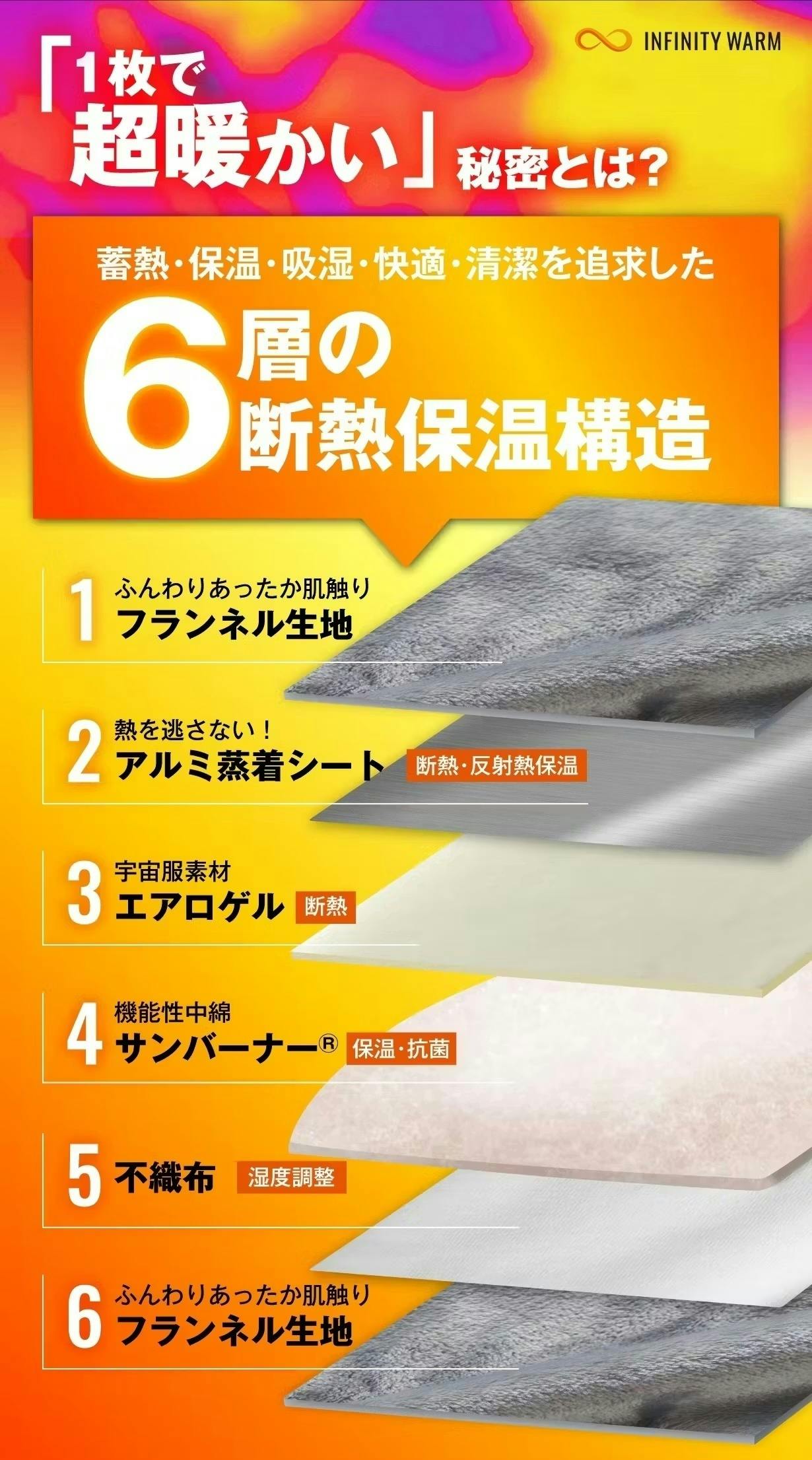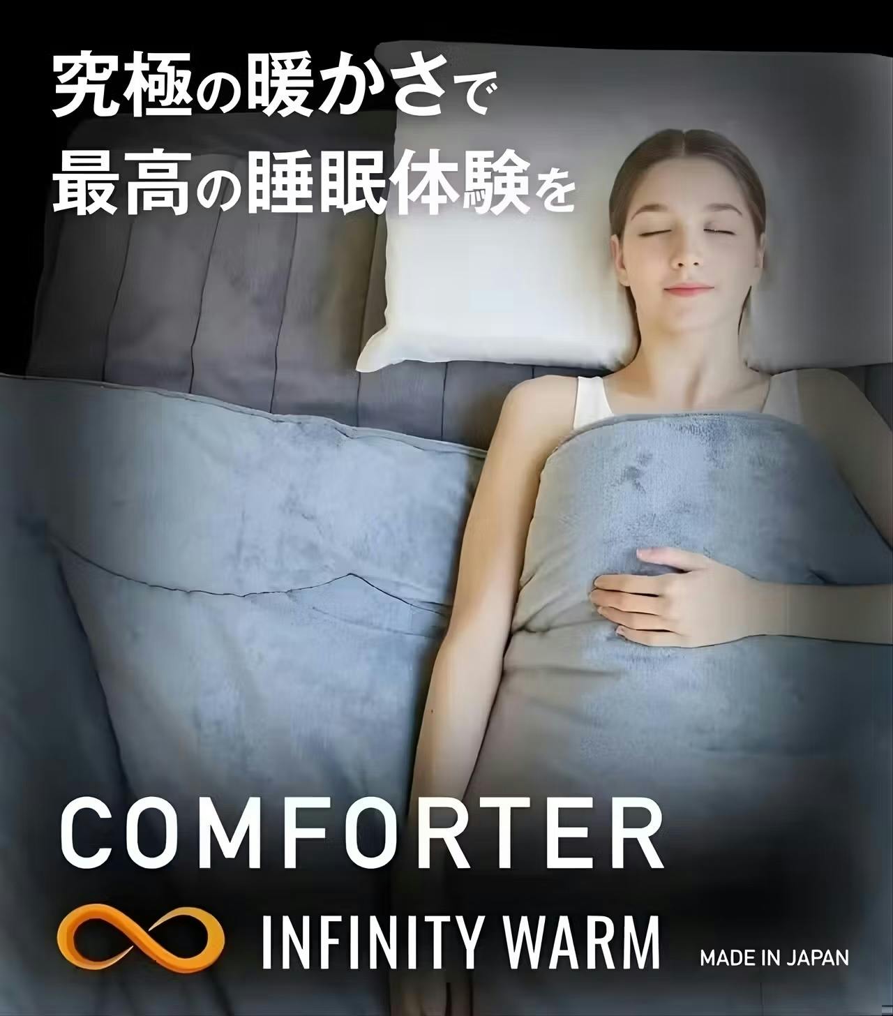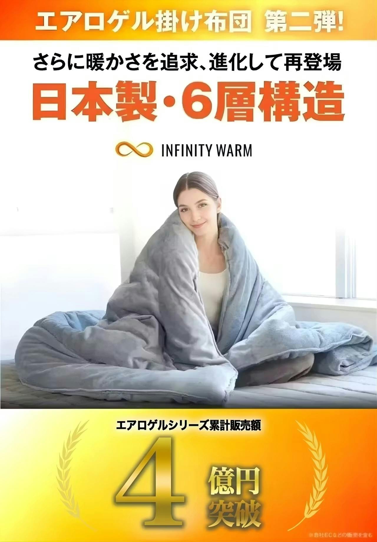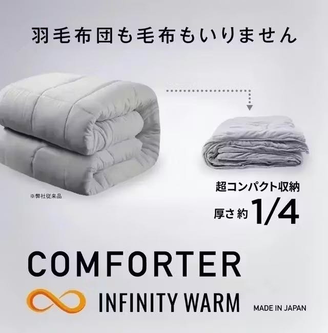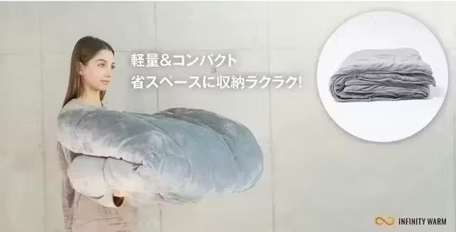 厚さ2mmで-196℃を断熱する宇宙服素材”エアロゲル”と日本製先端の吸湿発熱素材”SUNBURNER”の【最新2大素材】に進化し、極寒の真冬の寒さにも1枚で暖かい第2弾オールインワン掛け布団「INFINITY WARM」(インフィニティ ウォーム)が誕生しました。