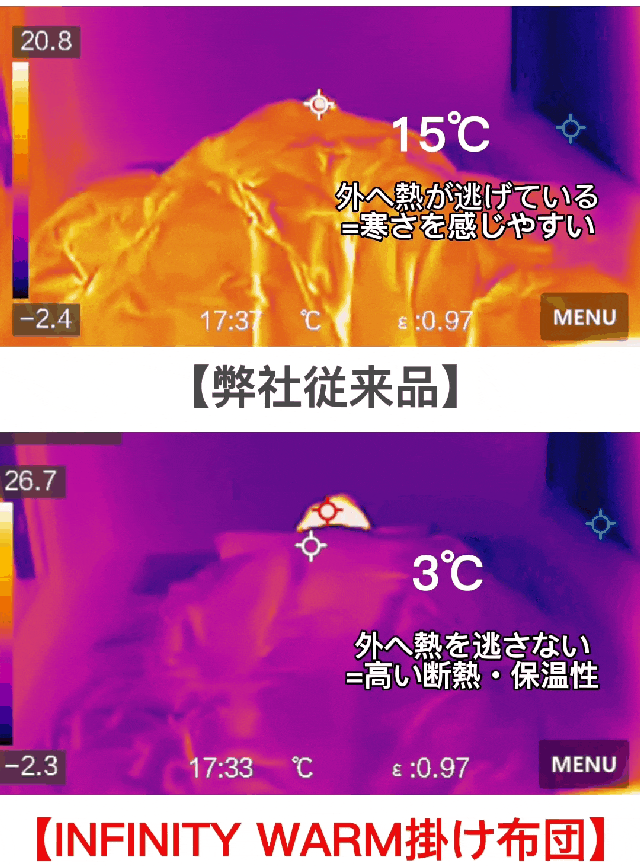 一方「INFINITY WARM」は、室内冷気を断熱しているので、布団から熱が逃しません。布団内側で熱をしっかり蓄えています。この検証から保温性の高さがわかります。