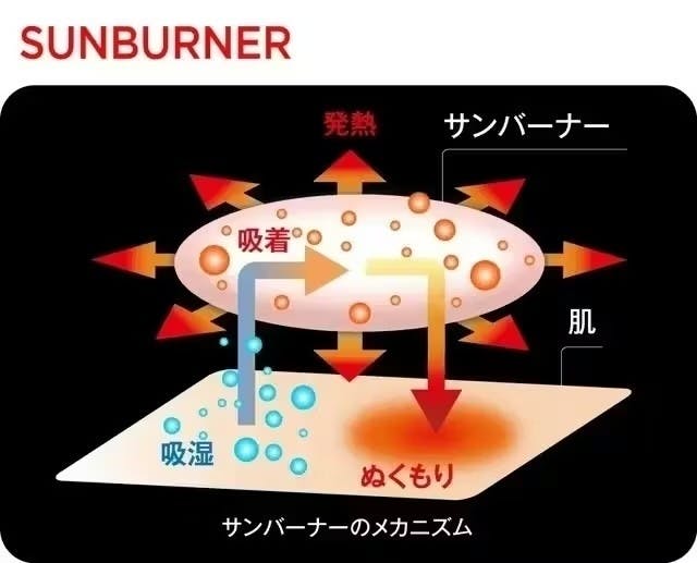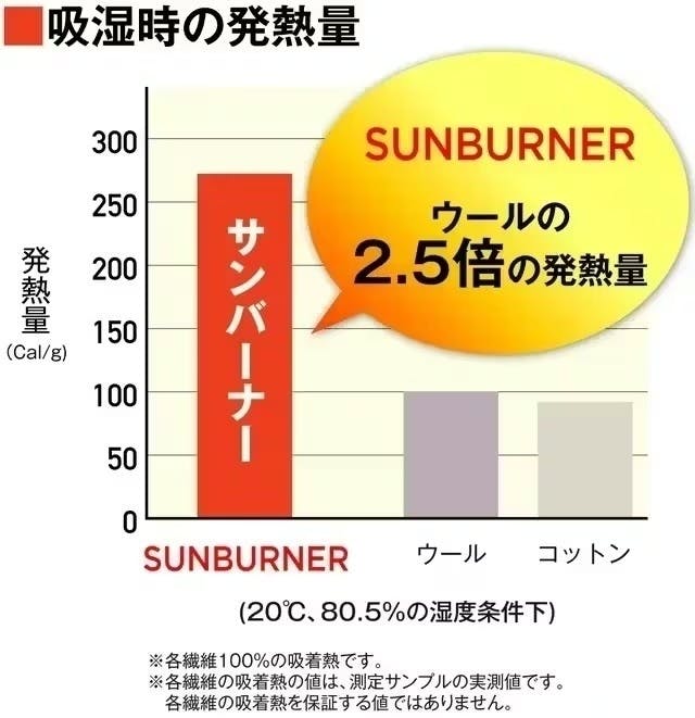 この繊維は、まわりの水蒸気を吸収するとき、「吸着熱」と呼ばれる熱が発生。「サンバーナー」は多くの親水基により高い吸湿能力を持ち「吸着熱」を発生させます。