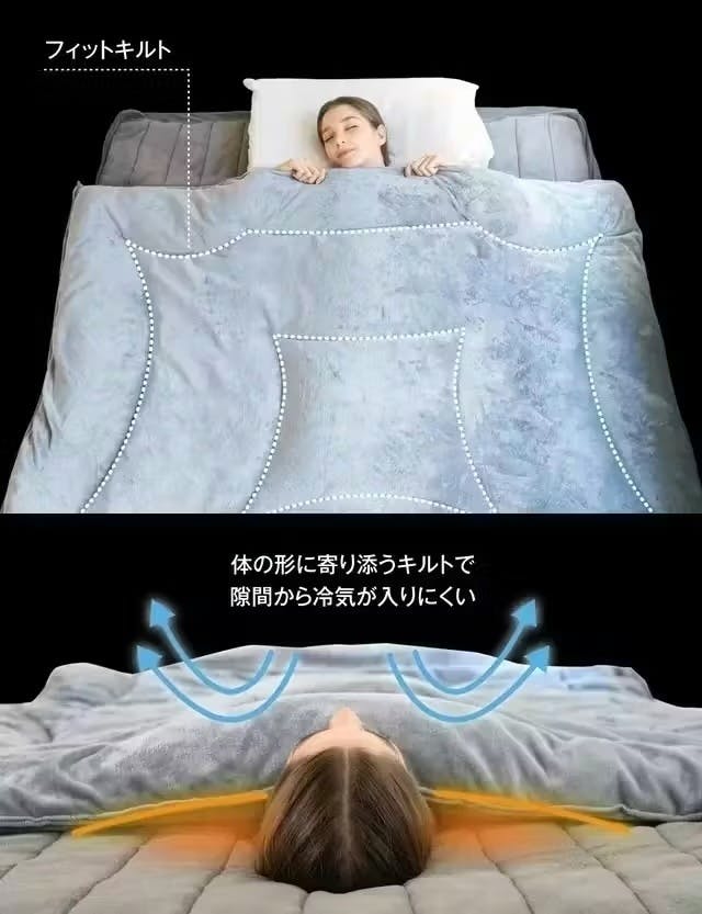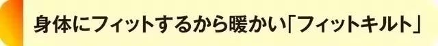 「フィットキルト」は隙間から冷気が入りにくいように設計された特殊なキルティングです。身体の幅に沿った設計のため、襟元やふとん四隅から冷気をシャットダウン!寝ている間に掛け布団がずれにくいため暖かい空気を逃さず、保温効果が抜群です。