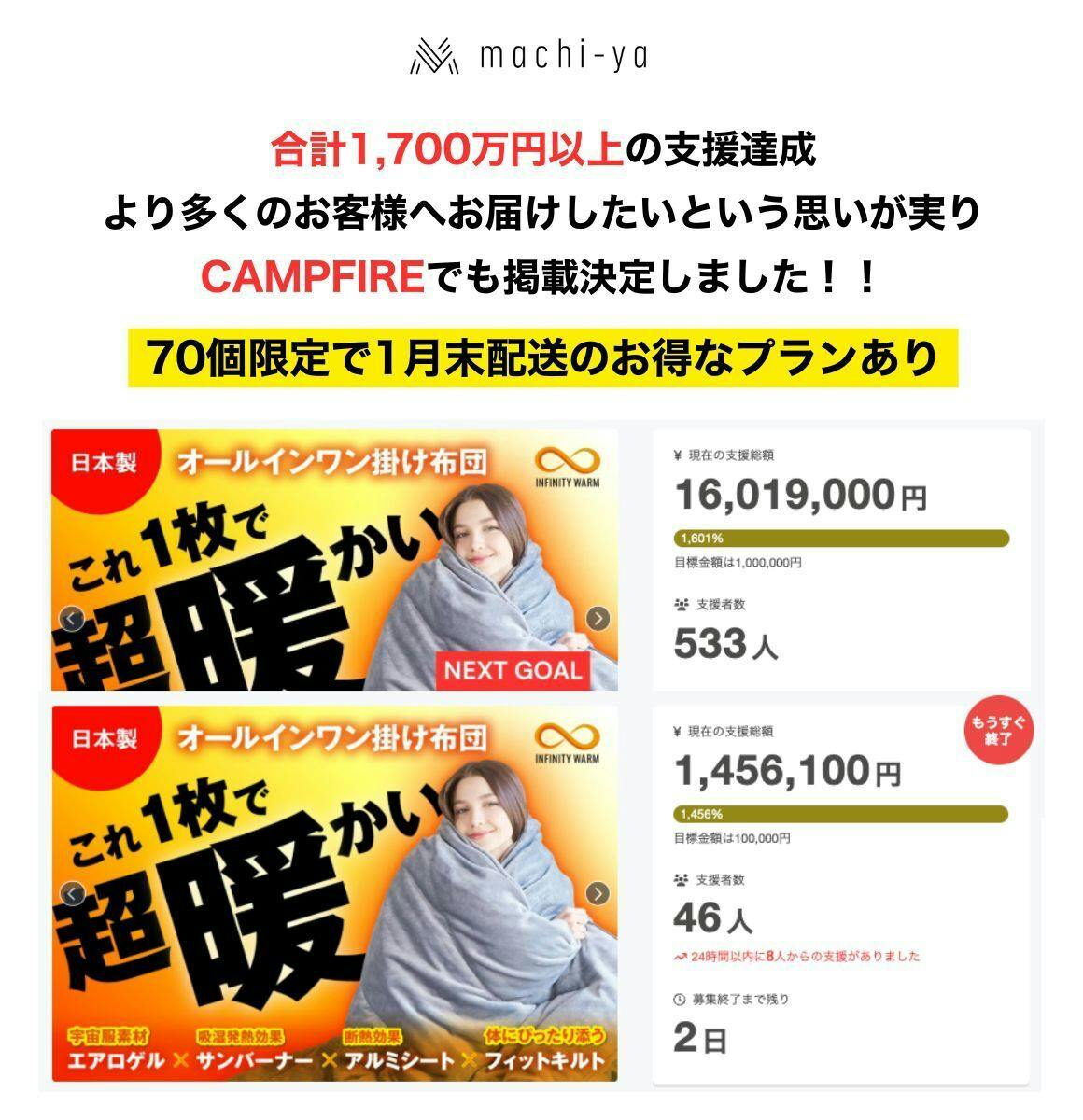 本プロジェクトでは、最新技術とテクノロジーを駆使した新素材の研究開発、及びアパレル製品開発・製造・販売を行っているシューポー(シャンハイ)ナノテクノロジー・カンパニー・リミテッドの提供する、宇宙服素材「エアロゲル」を採用した次世代オールインワン掛け布団として『INFINITY WARM』を起案しました。初期不良の交換、商品保証、ご購入後のアフターサービスも万全に行いますので、安心してご利用ください。